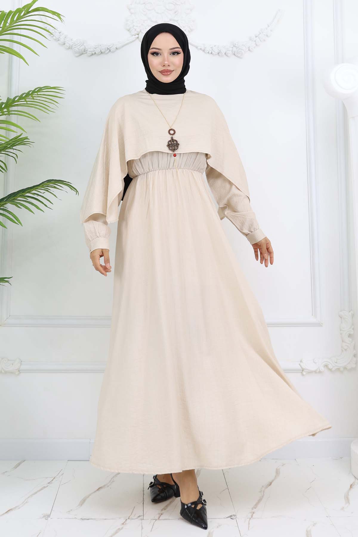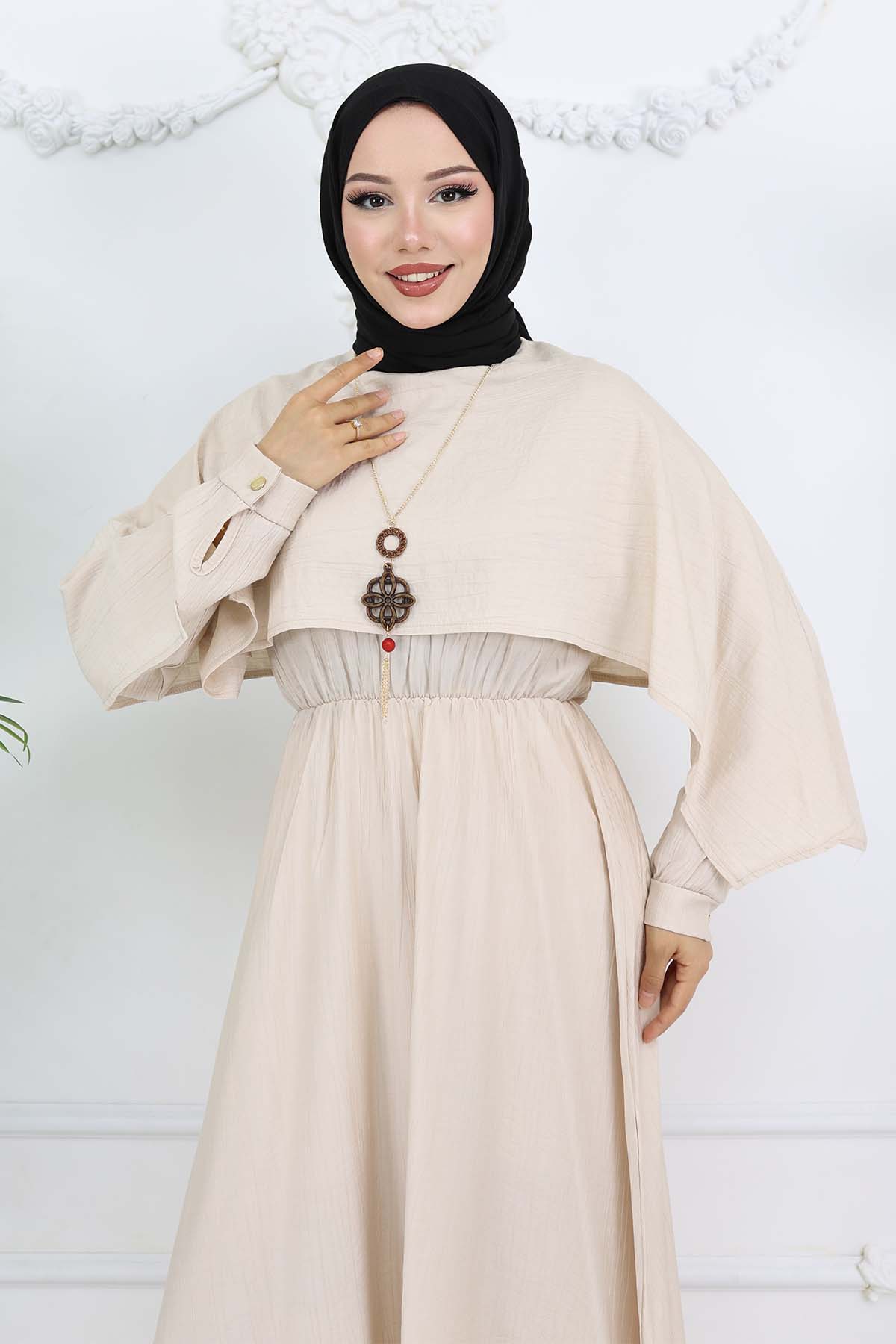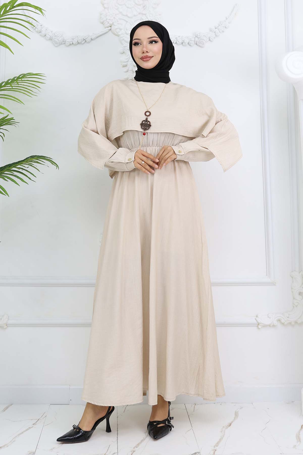 BNG Women Yaka Detaylı Kolyeli Elbise Taş Rengi 4809 - Erie