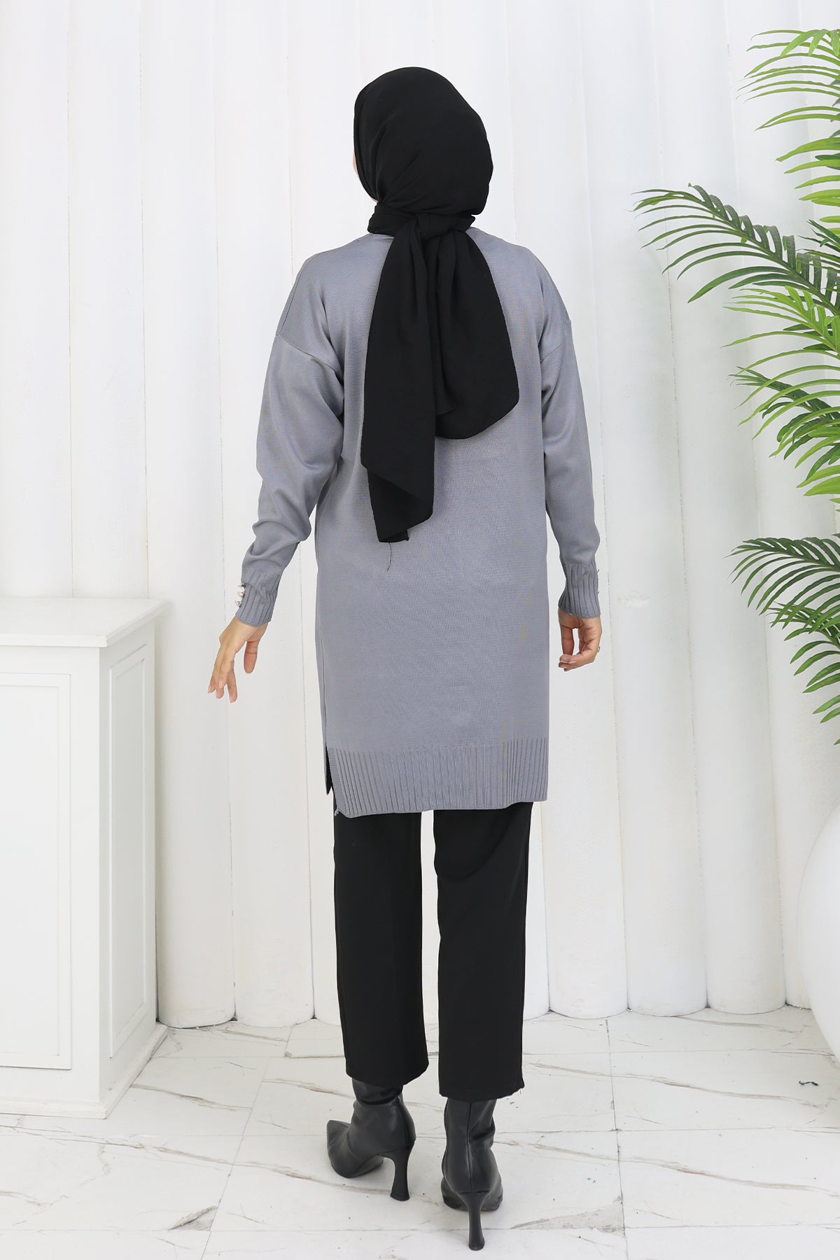 BNG Women Yaka Detaylı Uzun Merserize Hırka N3260 Gri - Marion