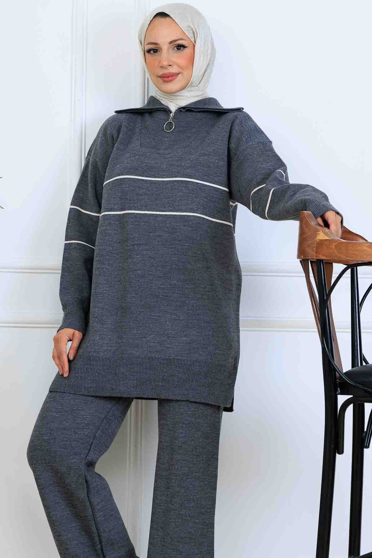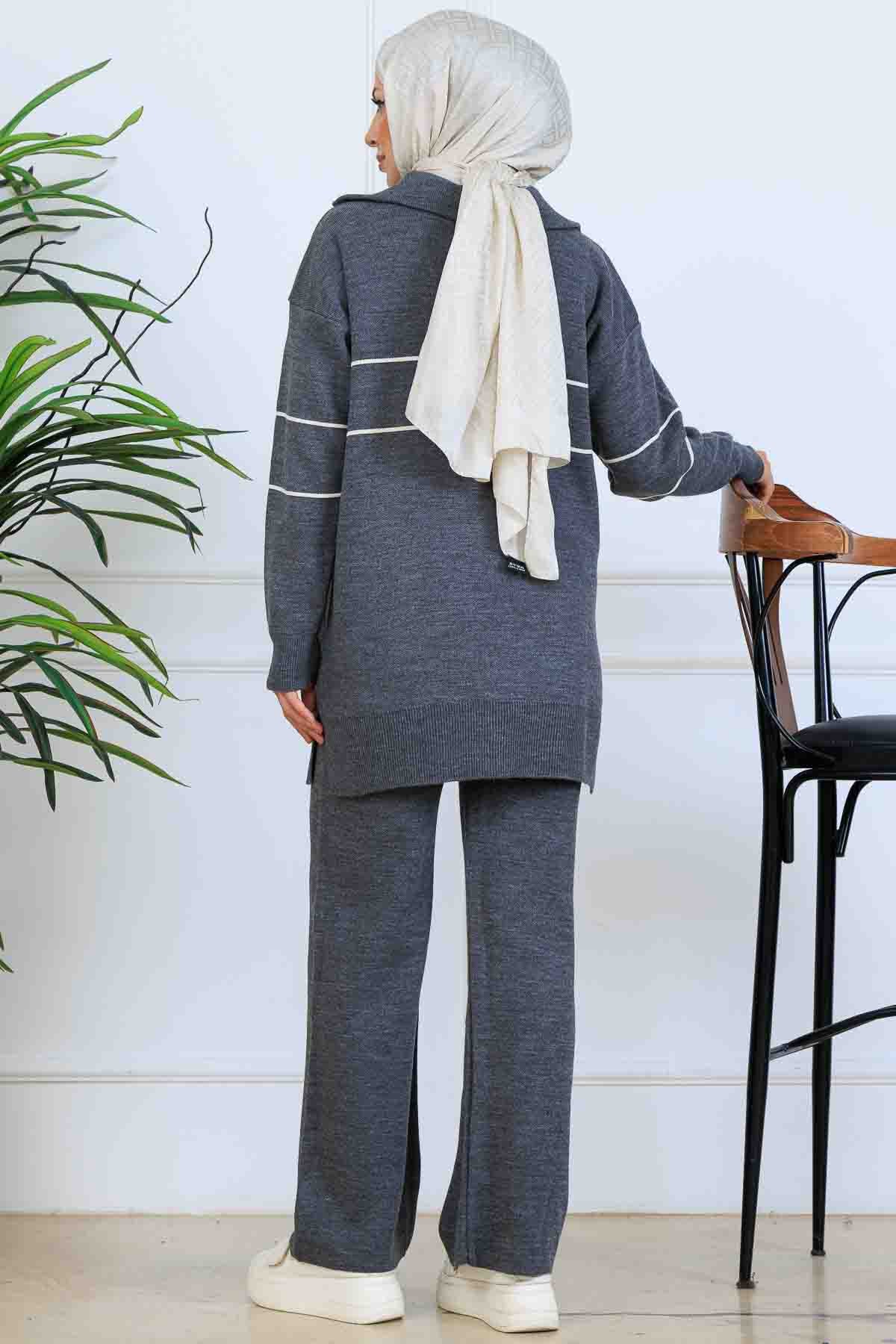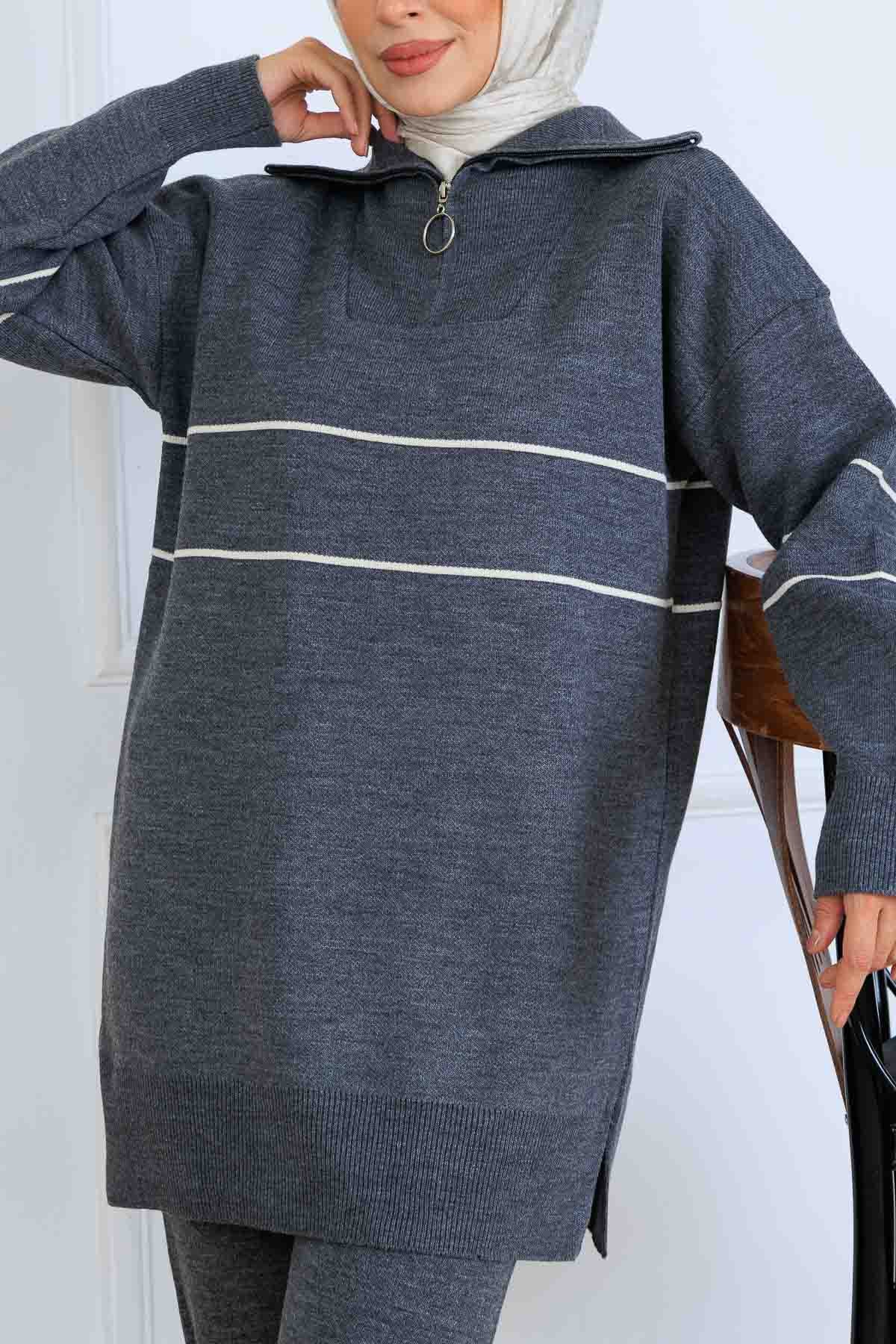 BNG Women Yakası Fermuarlı Şeritli Triko Takım S1050 Antrasit - Porta Westfalica
