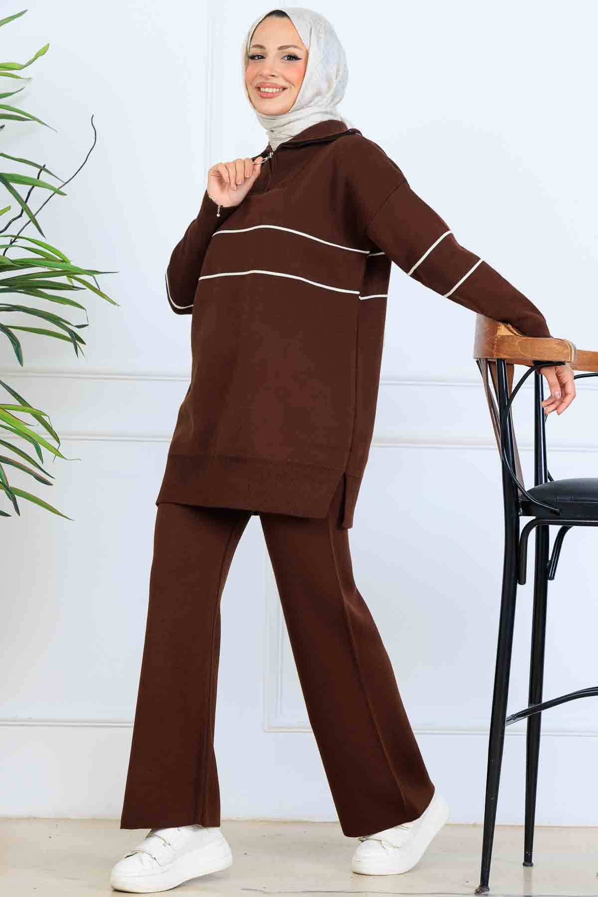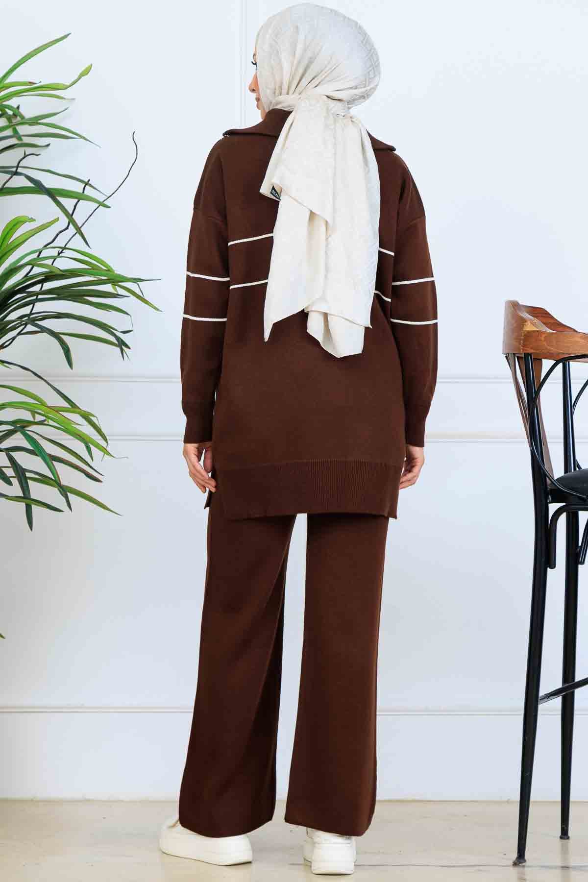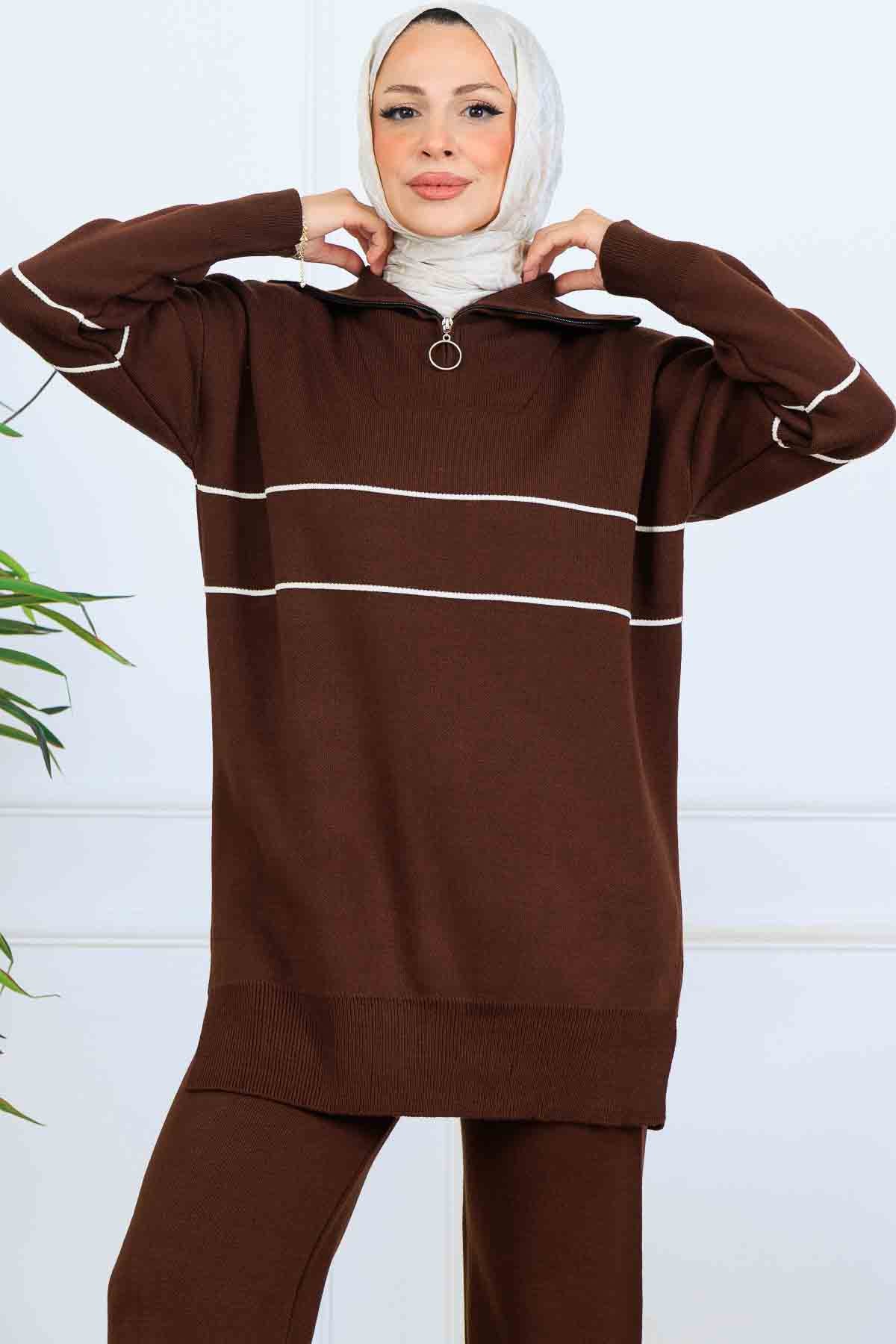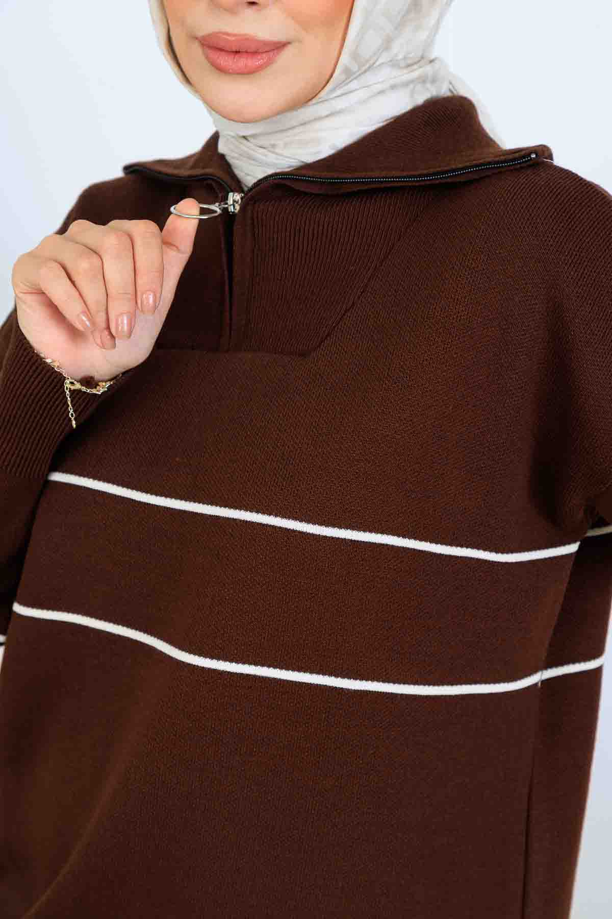 BNG Women Yakası Fermuarlı Şeritli Triko Takım S1050 Kahverengi - Severna Park
