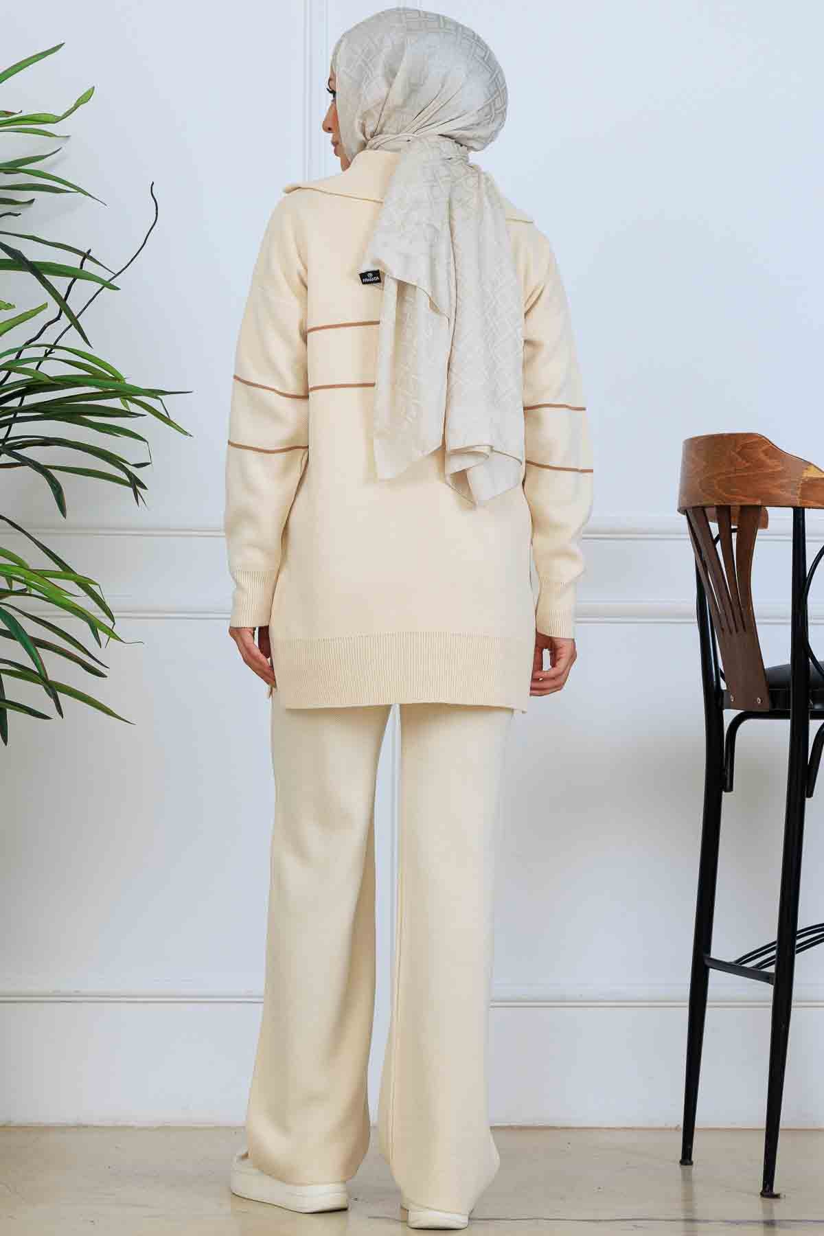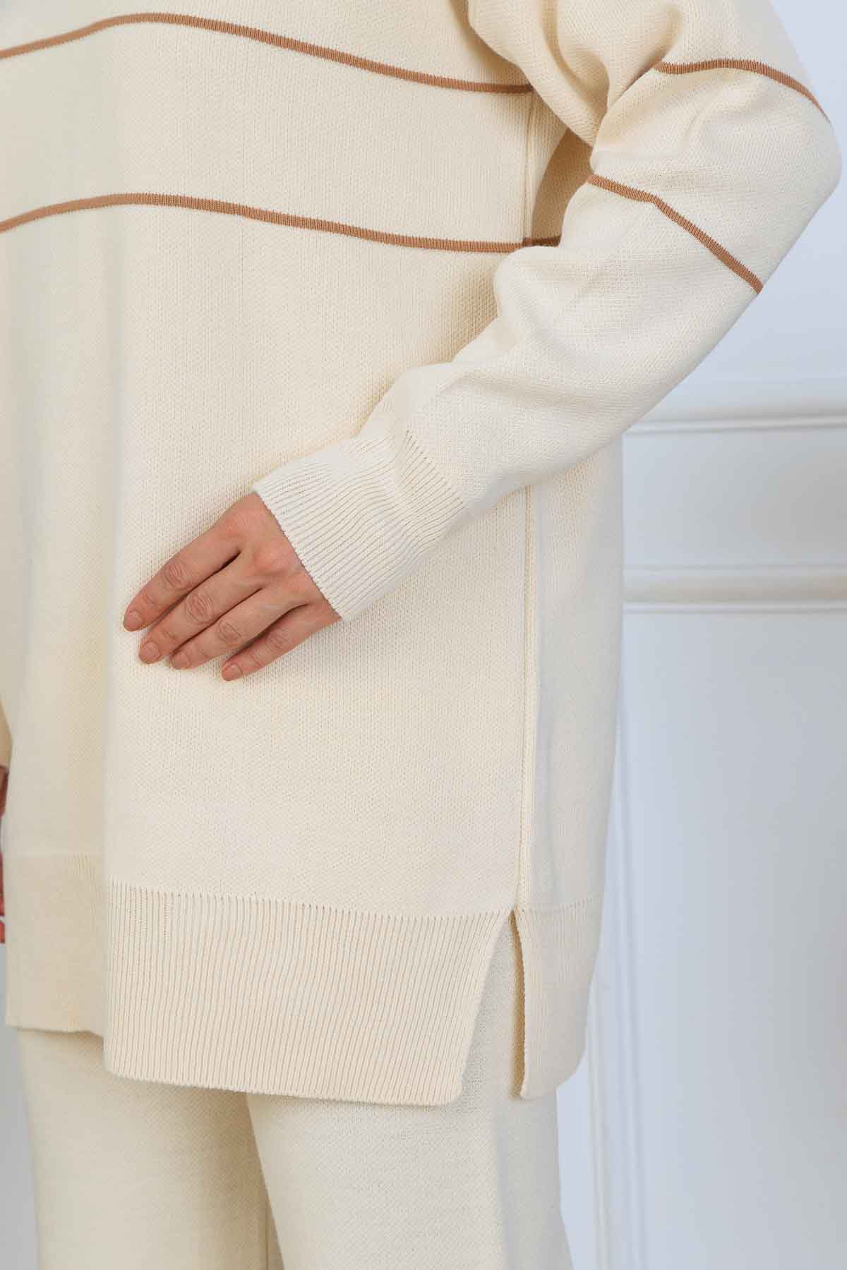 BNG Women Yakası Fermuarlı Şeritli Triko Takım S1050 Taş Rengi - Cortazar