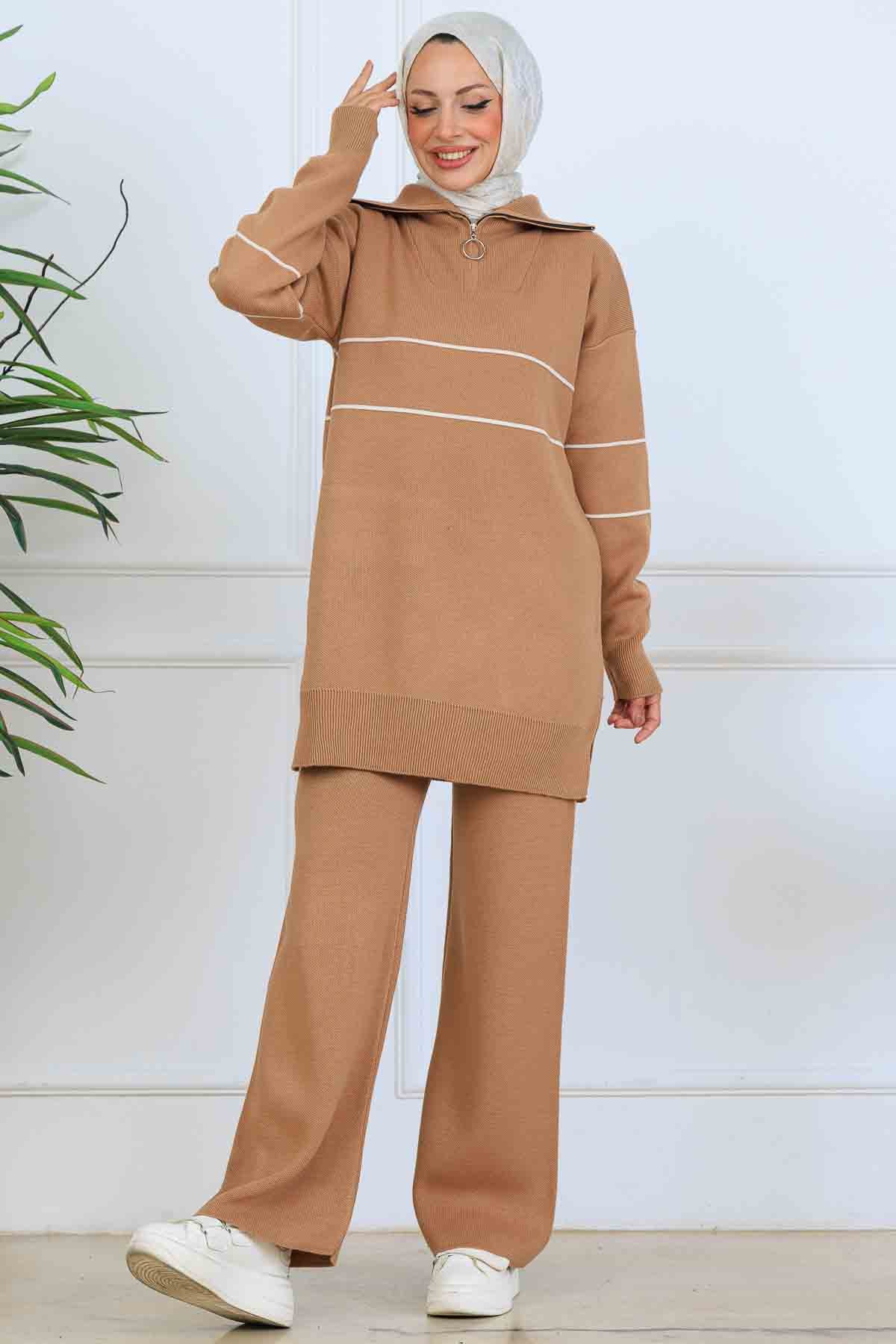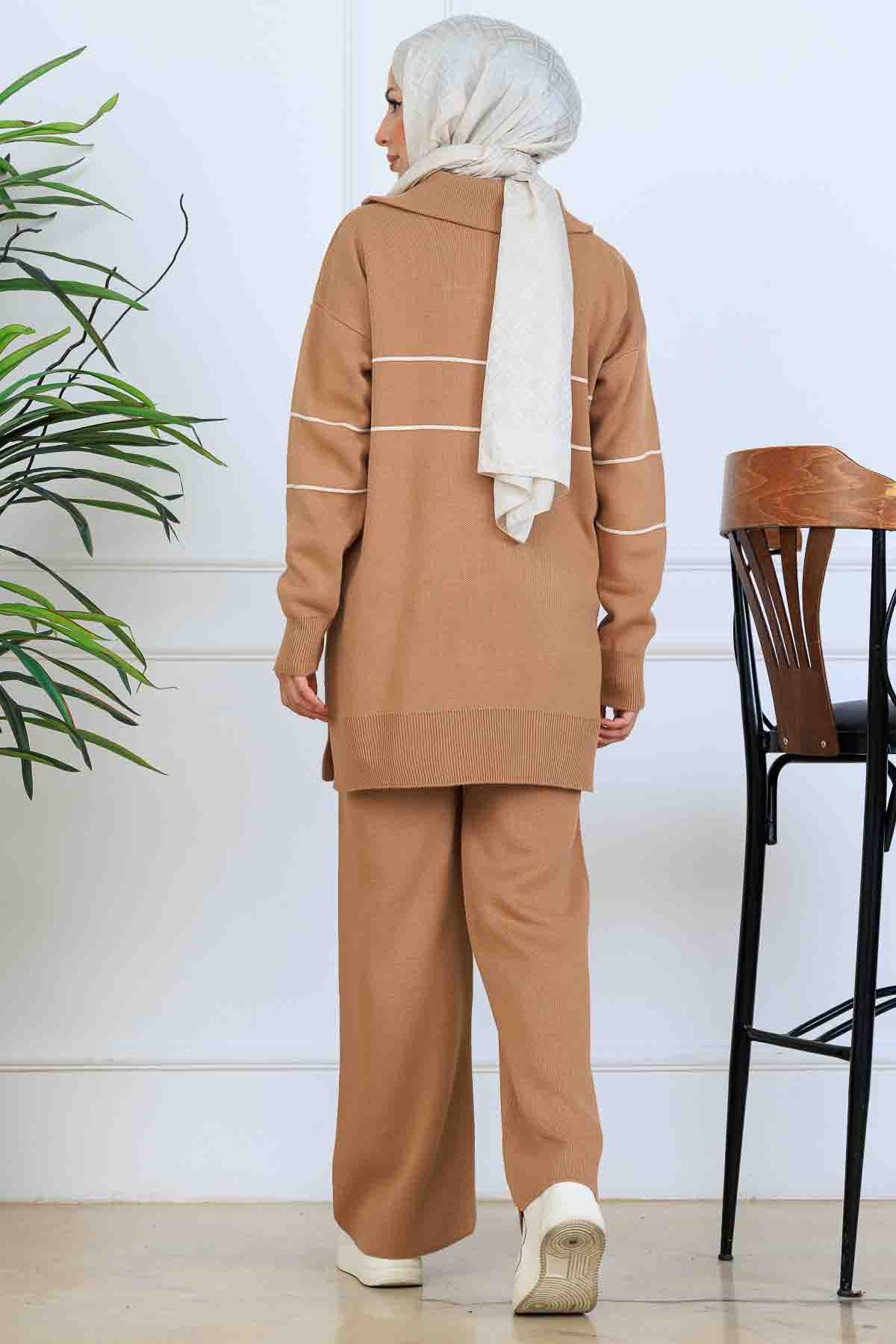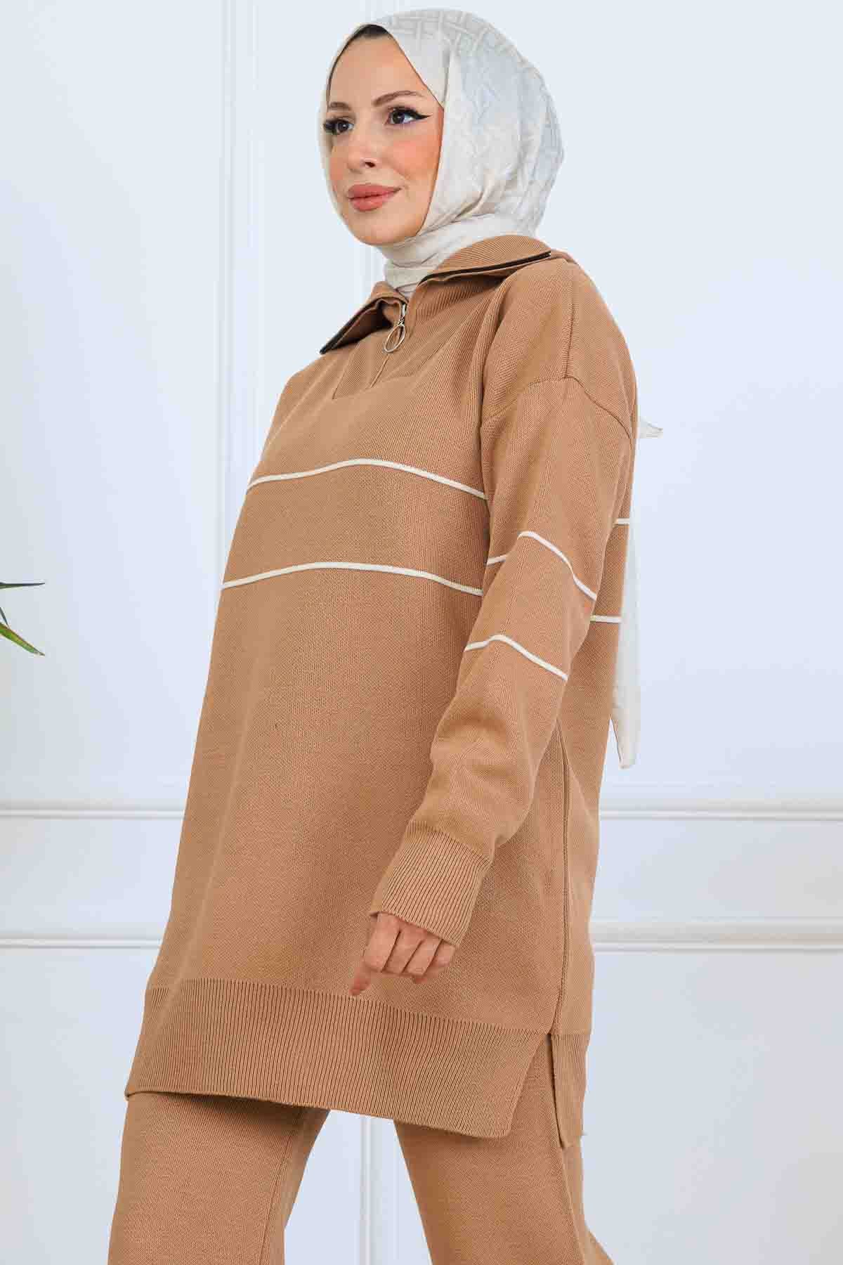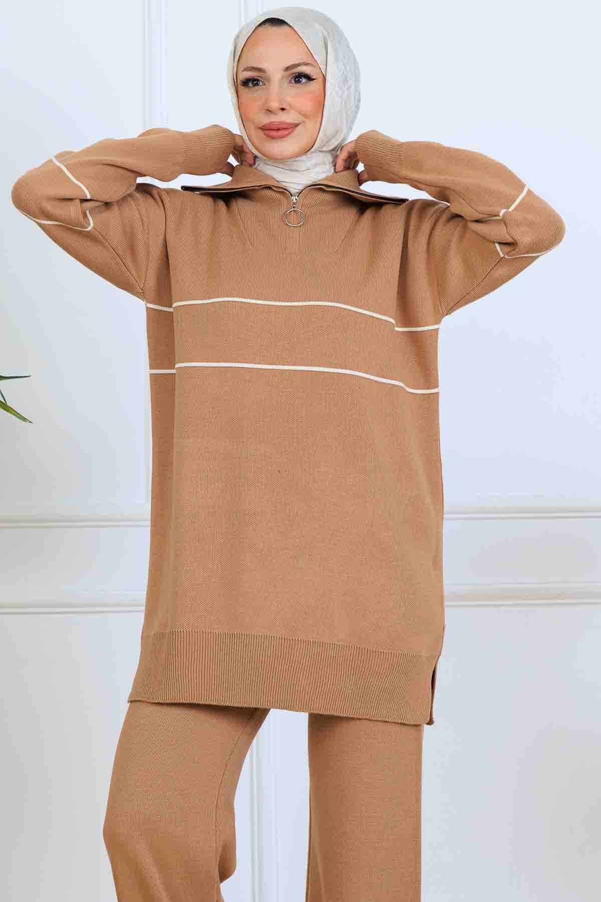 BNG Women Yakası Fermuarlı Şeritli Triko Takım S1050 Vizon - Makiivka
