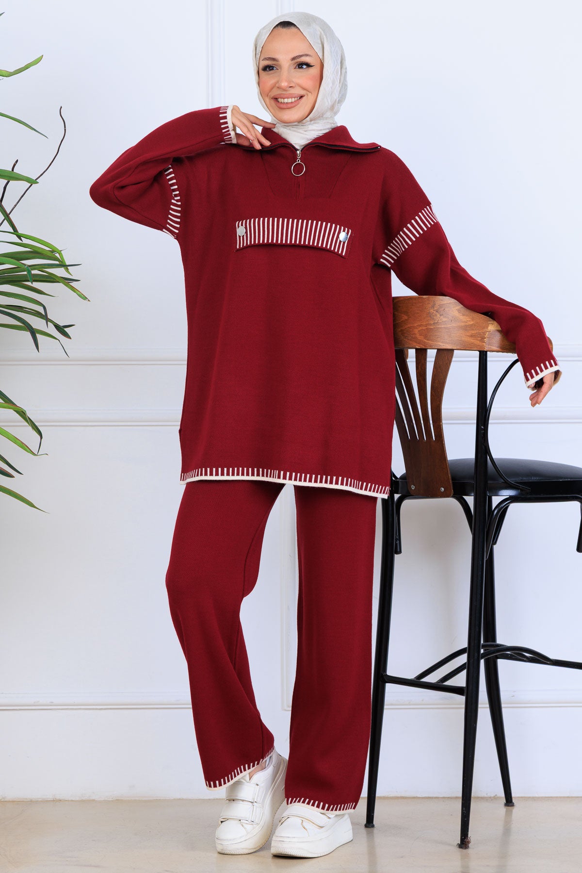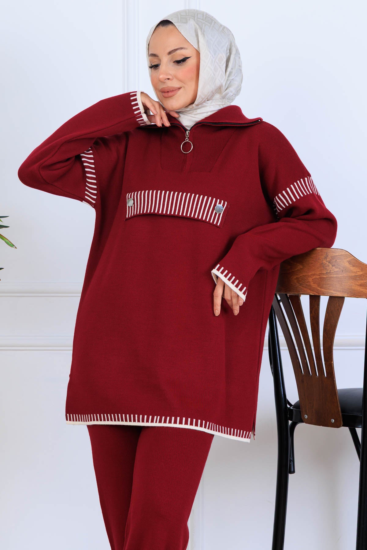 BNG Women Yakası Fermuarlı Triko Takım S1105 Bordo - Woodland