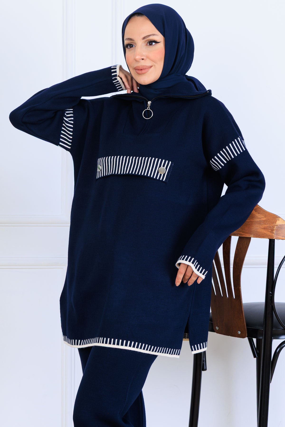 BNG Women Yakası Fermuarlı Triko Takım S1105 Lacivert - Visalia