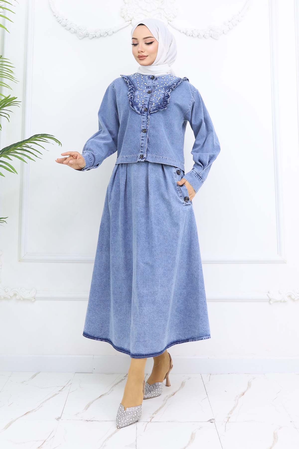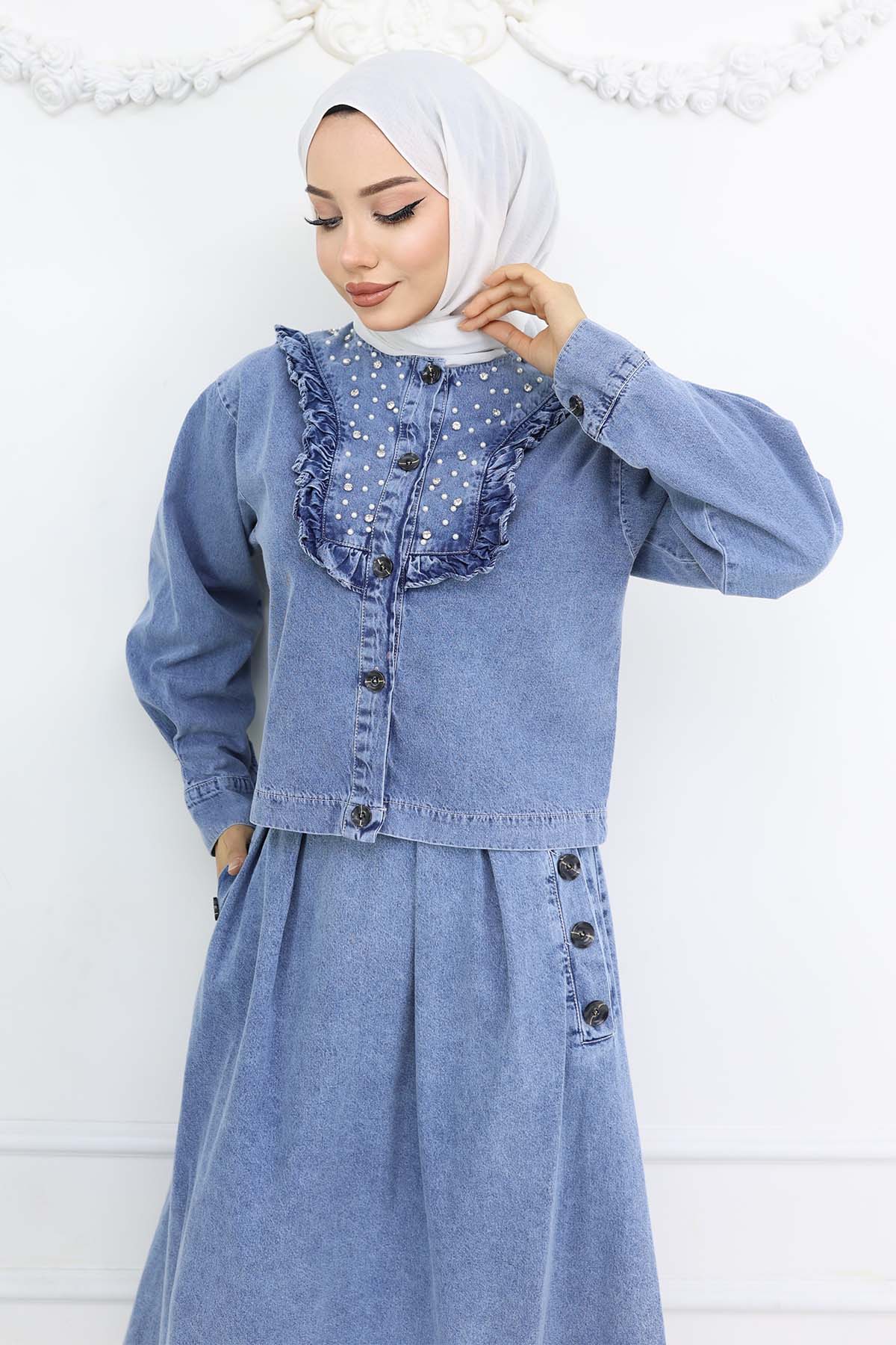 BNG Women Yakası İnci Detaylı Kot Etekli Takım Mavi 6120 - Marcianise