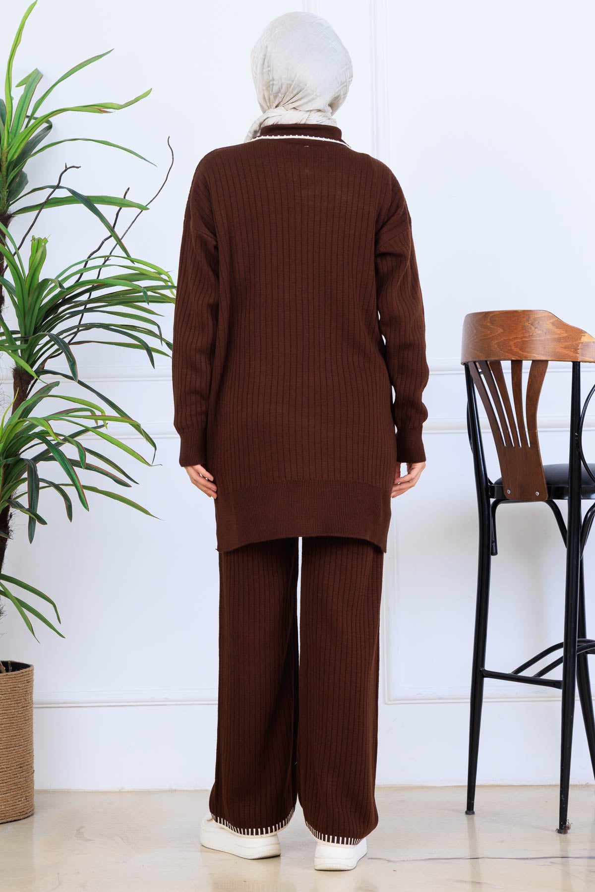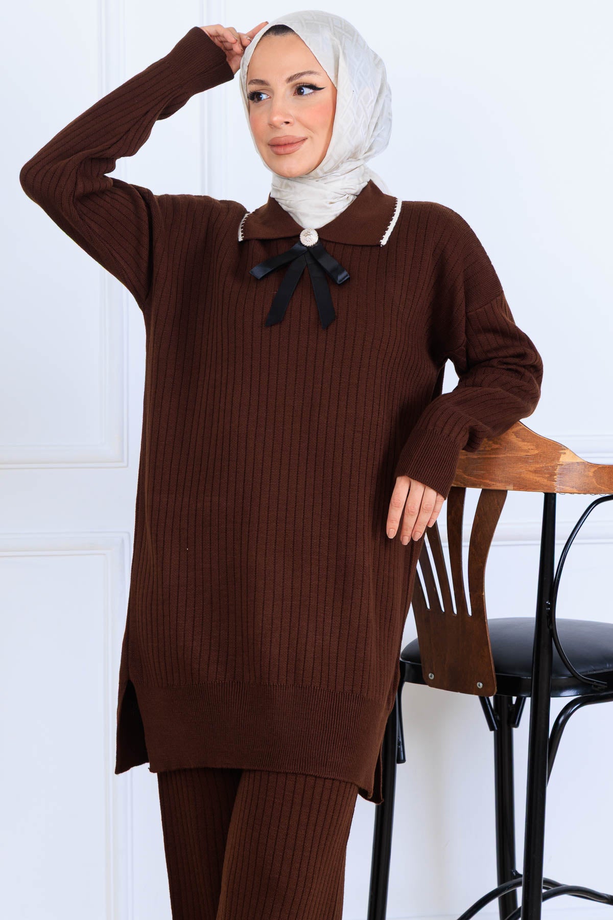 BNG Women Yakası Kurdele Detay Triko Takım S1064 Kahverengi - Matosinhos