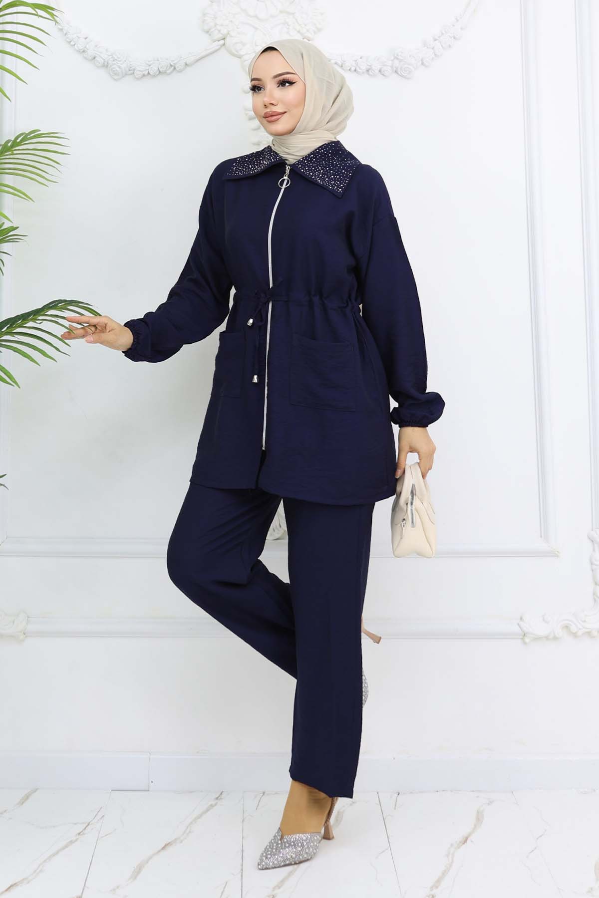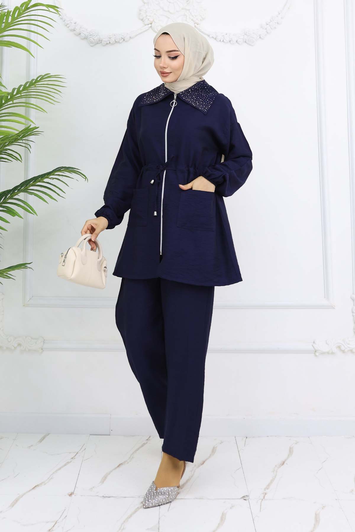BNG Women Yakası Taş Detaylı Tesettür Takım Lacivert 4727 - Banbury