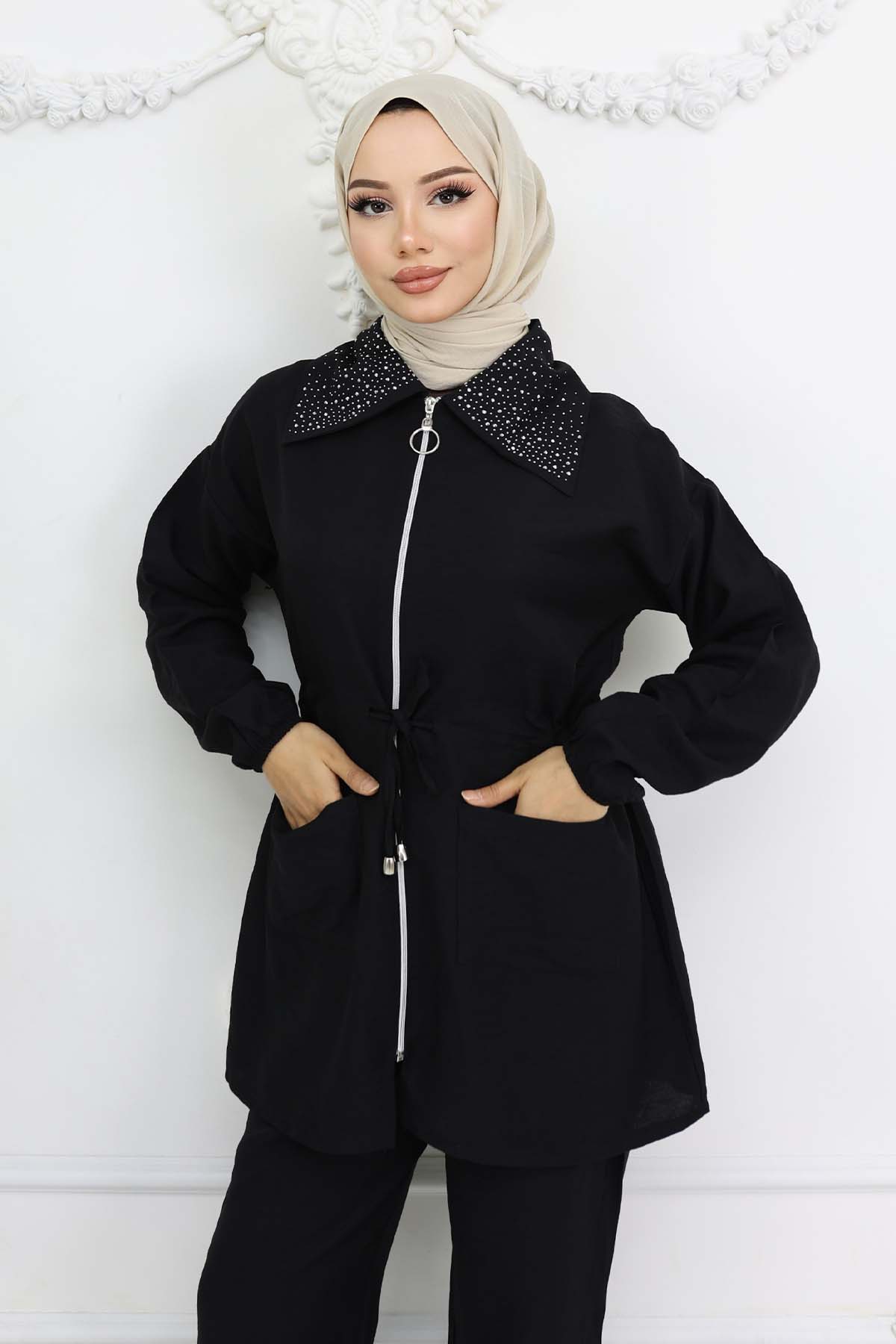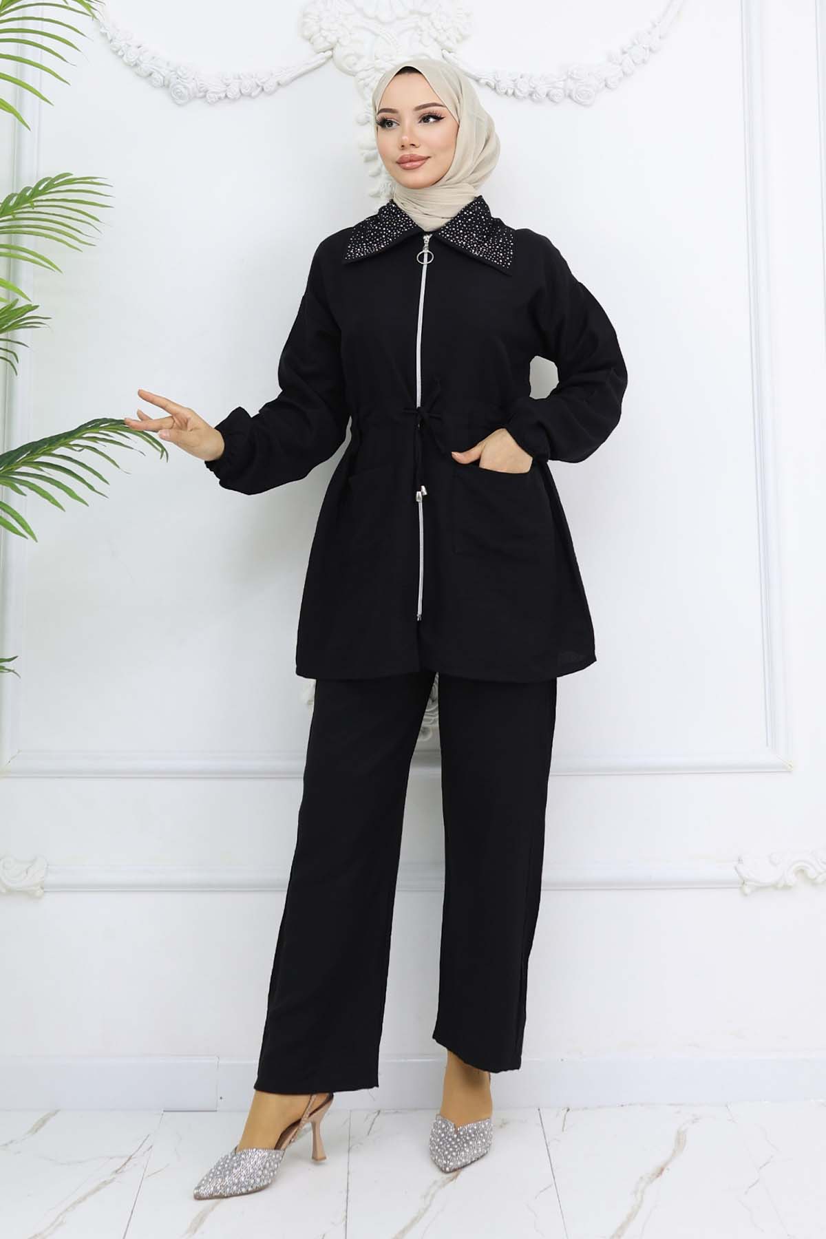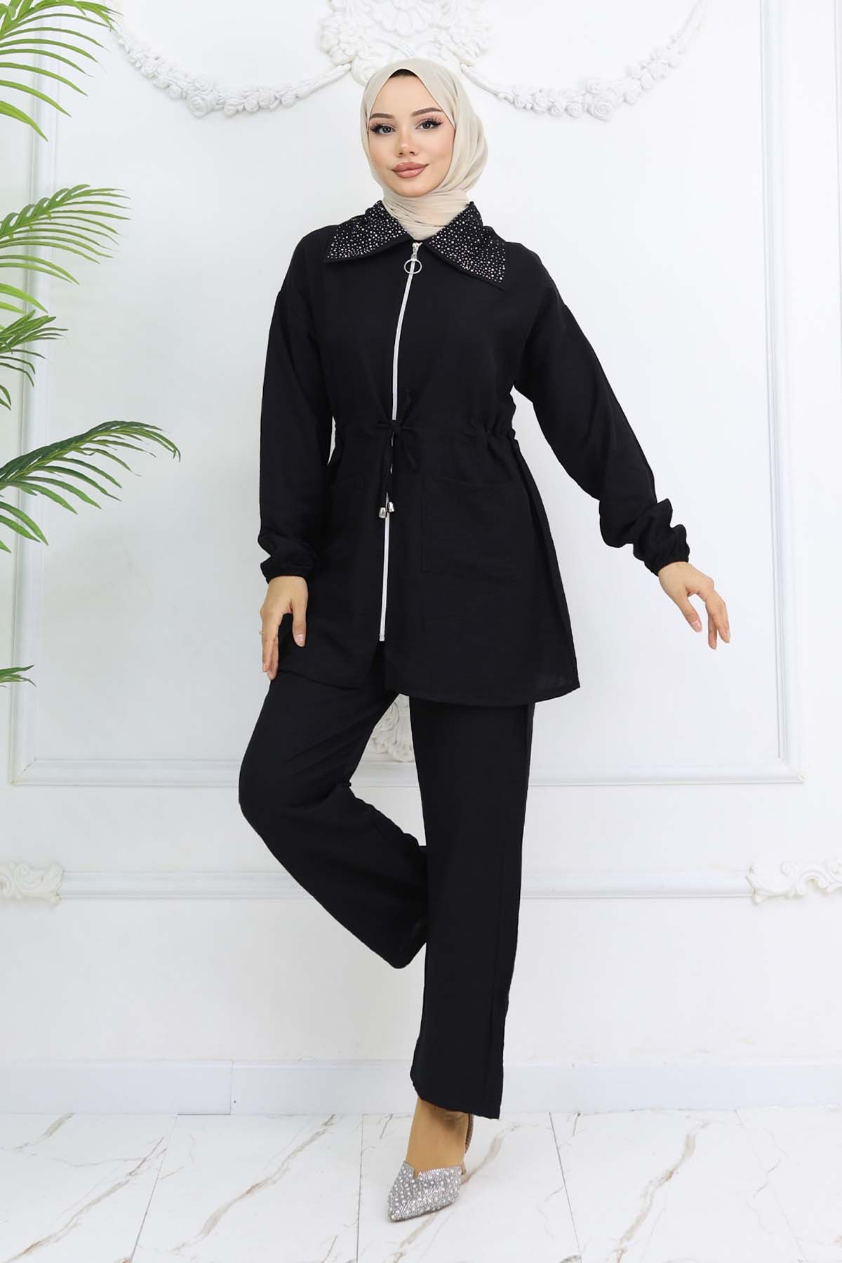 BNG Women Yakası Taş Detaylı Tesettür Takım Siyah 4727 - Florence