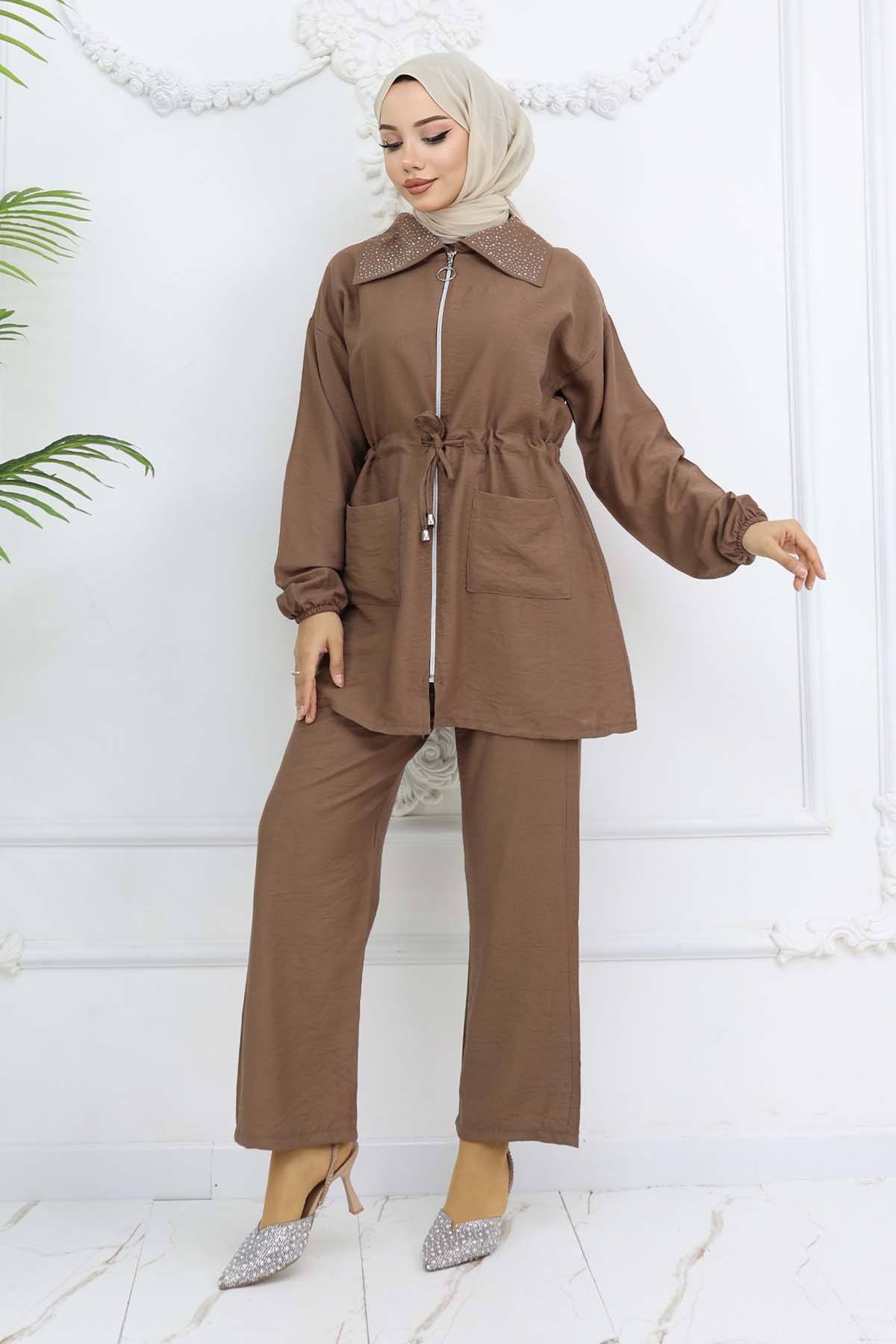 BNG Women Yakası Taş Detaylı Tesettür Takım Taba 4727 - Nashville