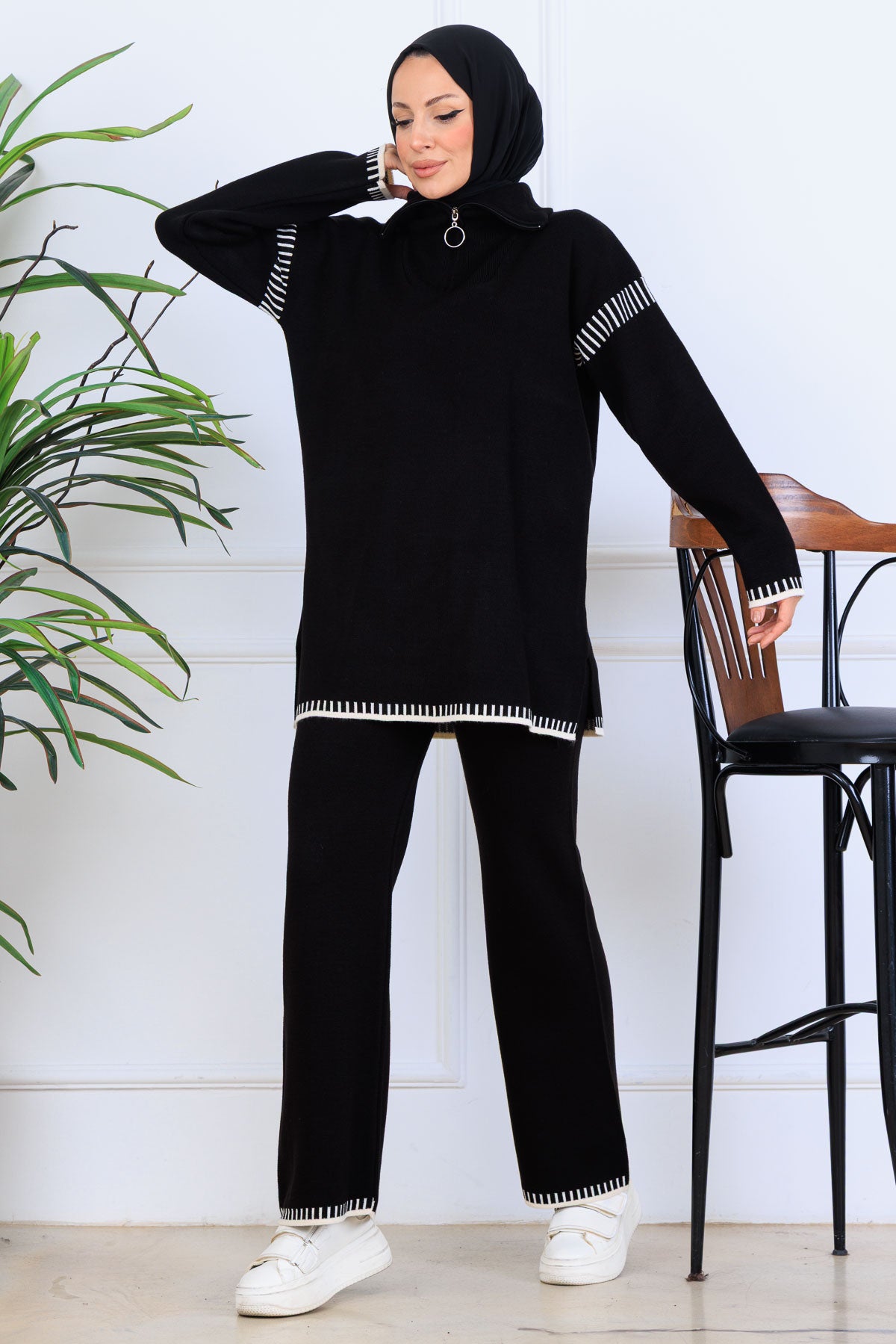 BNG Women Zippered Collar Striped Detail Knit Set S1061 Black - Mount Juliet