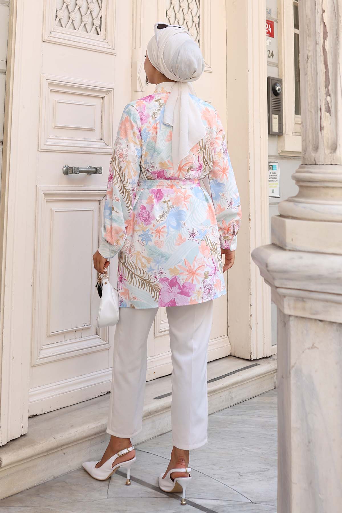 Product Feature: The product is true to size, you can choose your regular size. Product Information: Length: 80 cm, Bust: 100 cm. Fabric Type: 70% Cotton, 30% Polyester. Model Measurements: Height: 166 cm, Bust: 90 cm, Waist: 71 cm, Hips: 91 cm. The product on the model is size S/M. Our shirt has a mandarin collar design and buttons up fully at the front. The belted design adds elegance to your outfits. Made from Jessica fabric, it is a summer, flowy, non-transparent, and non-sweat-inducing fabric. It does not shrink or fade when washed at 30 degrees delicate setting. Due to concept photoshoots, there may be a slight difference in color of the product.