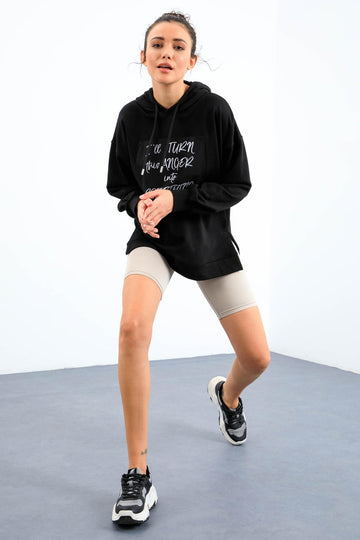 Black Textured Patchwork Hooded Women's Oversized Sweatshirt - 97178