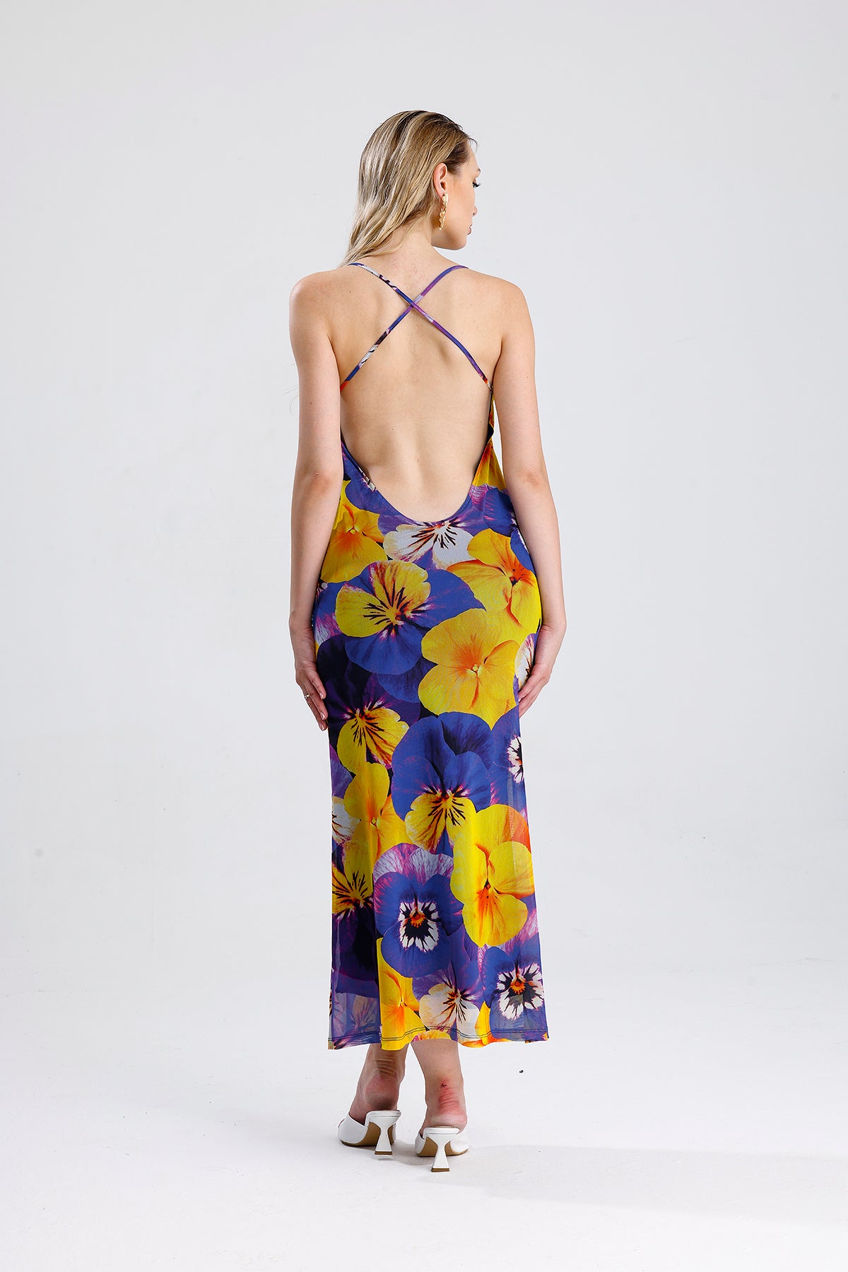 SNS Sense Yellow Purple Violet Patterned Flower Patterned Halter Neck Lined Long Dress - Châteauroux