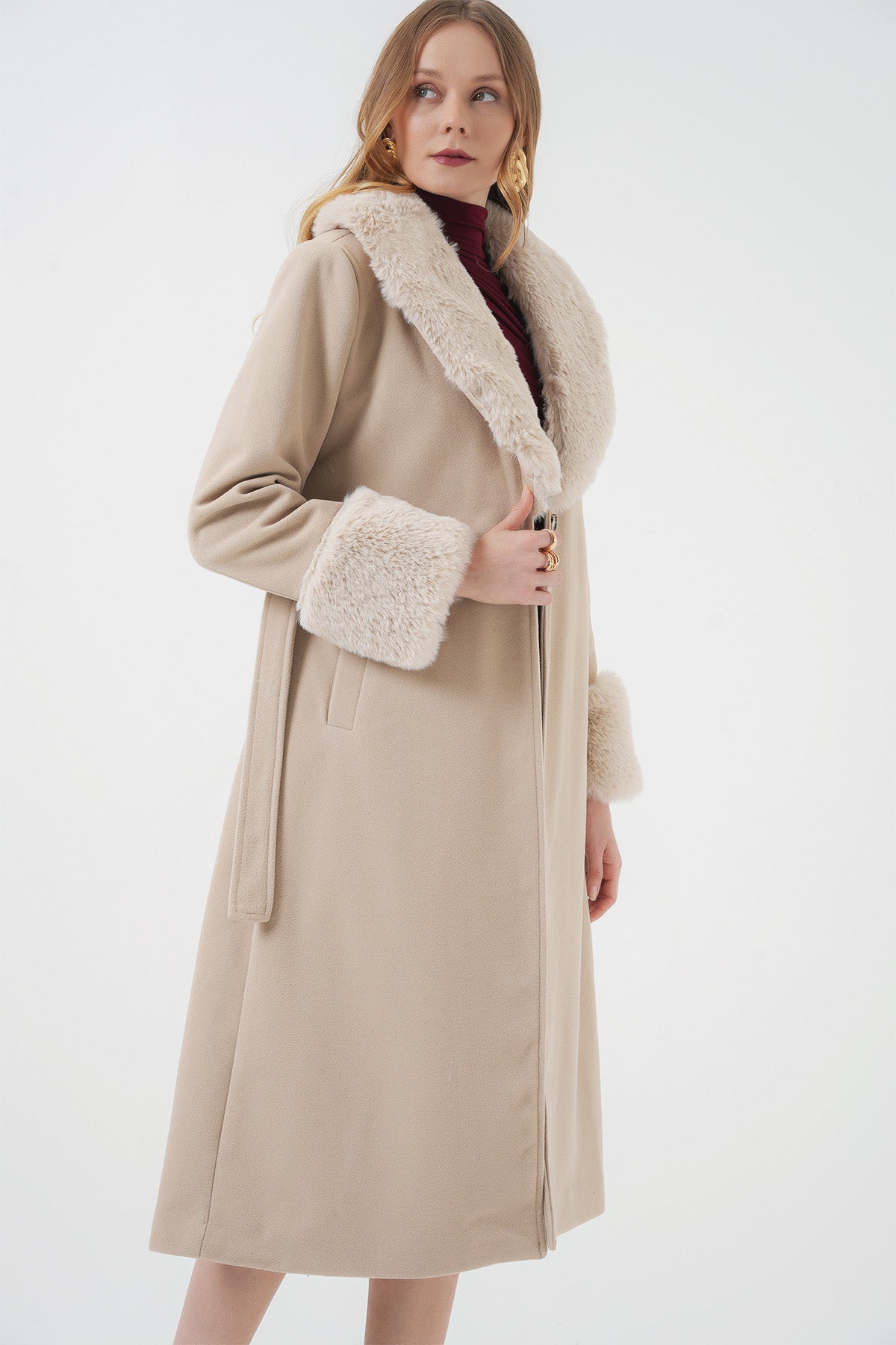 BGD Women Fur Detail Long Coat - Beige - Ramsgate