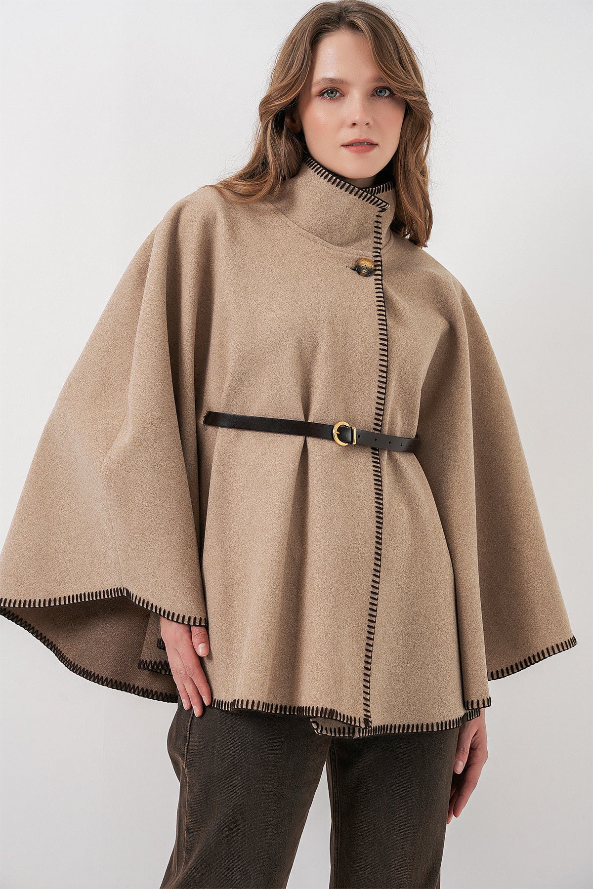 BGD Women Woman's Stitch Detailed Cape Coat 9166 - Light Beige - Alsdorf