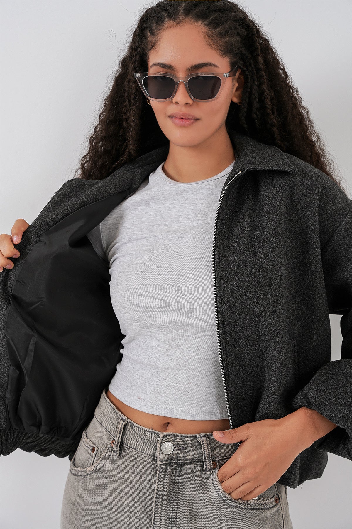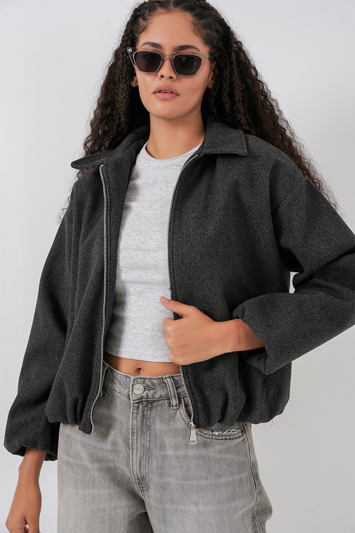 BGD Women Kadın Büzgülü Oversize Kaşe Ceket 0728 - Antrasit - Kitchener