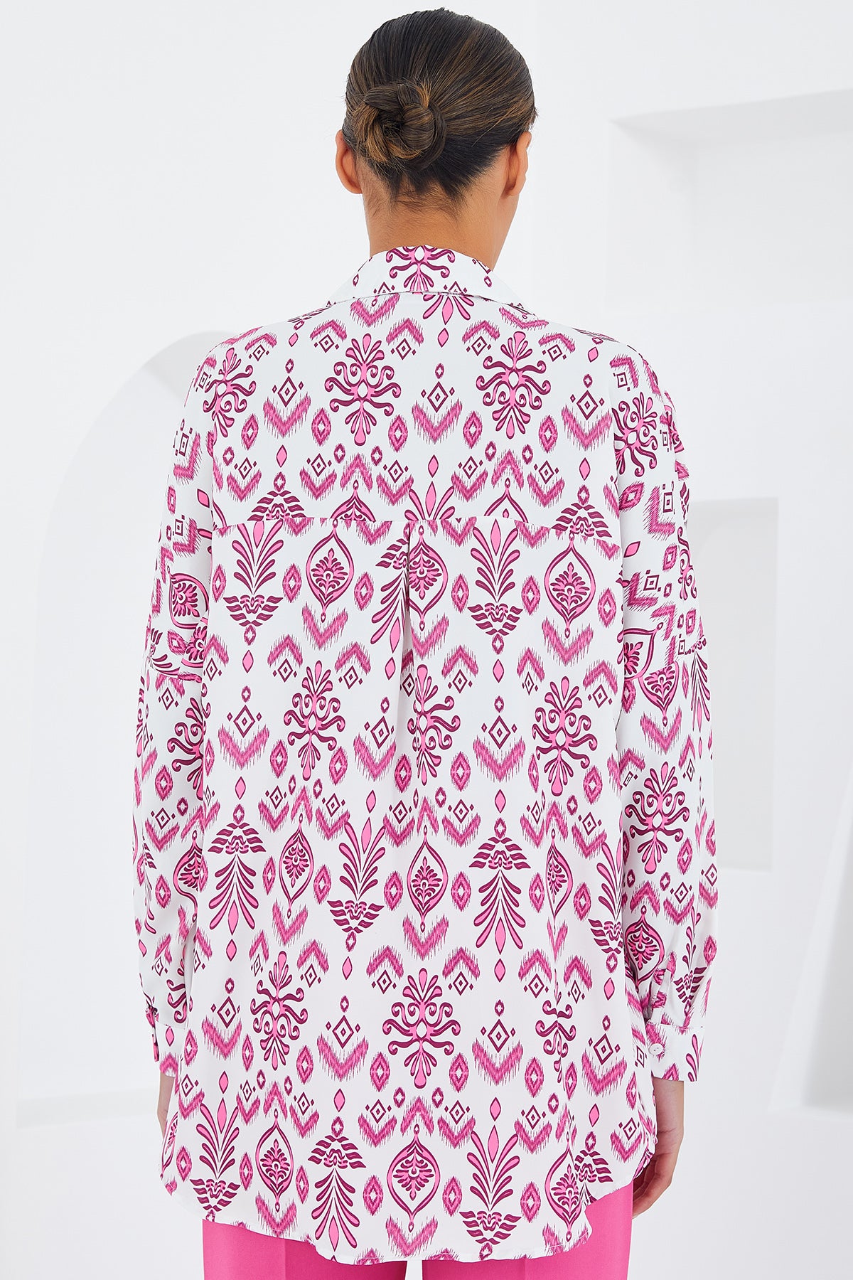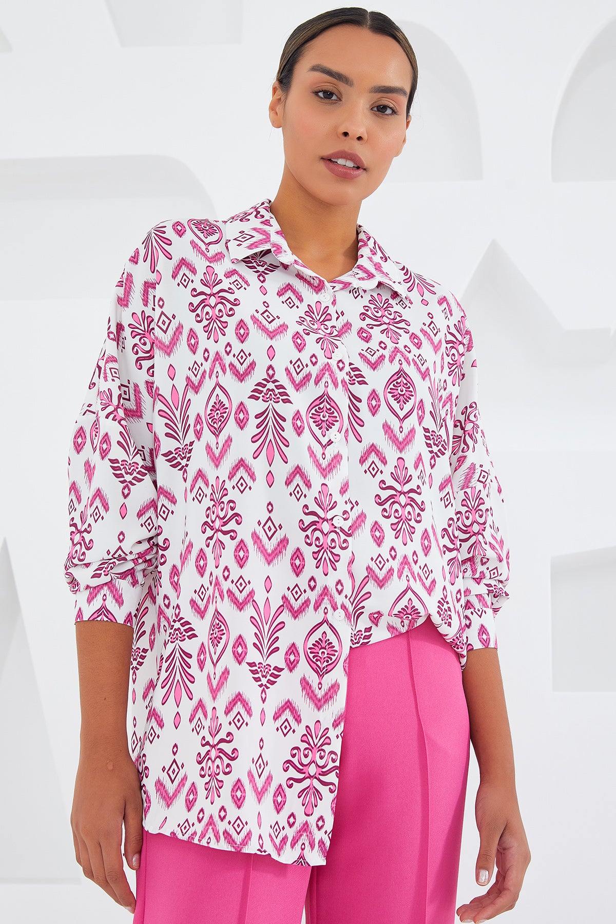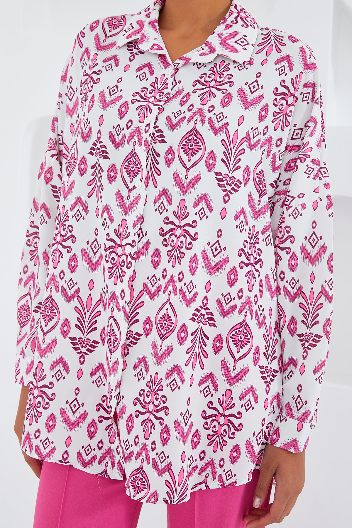 BGD Women Kadın Fuşya Beyaz Desenli Oversize Saten Gömlek 3985 - Kozáni