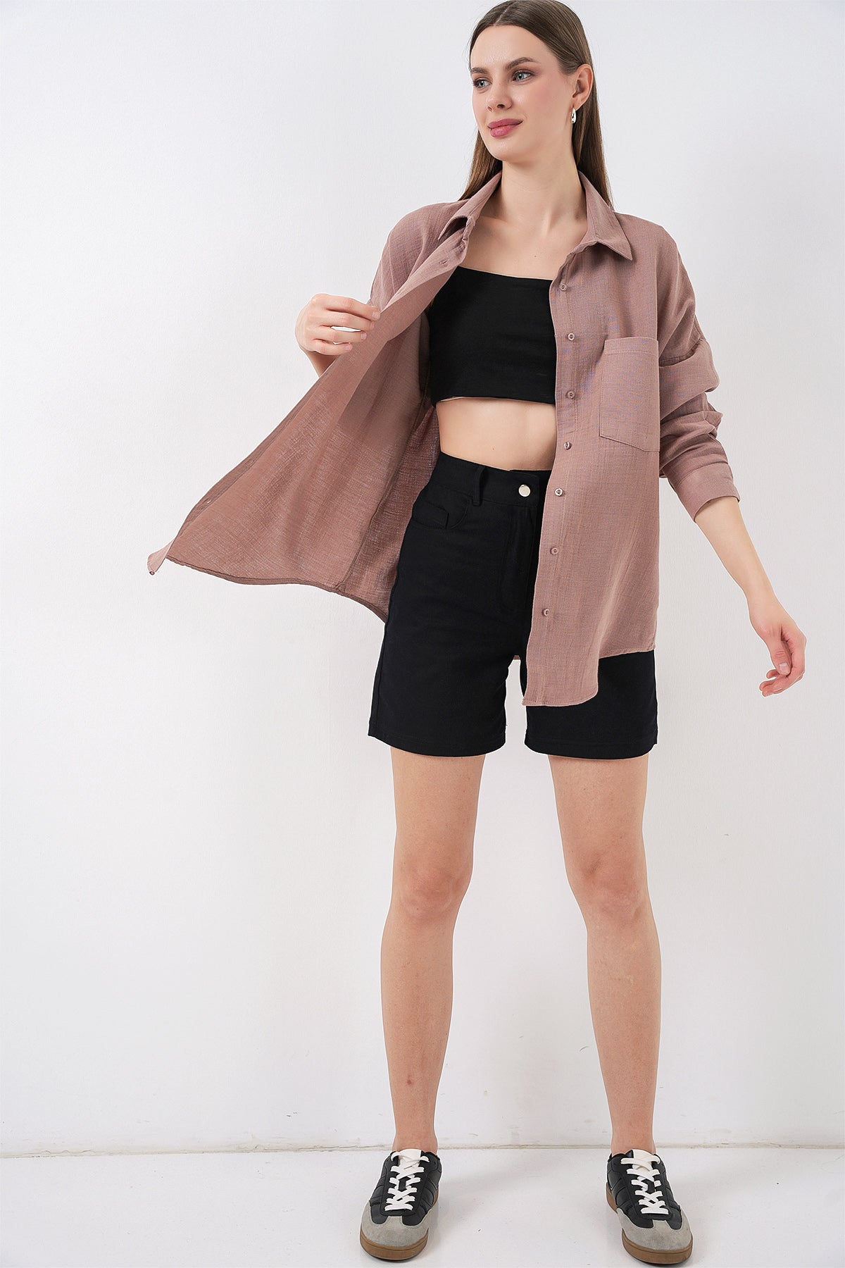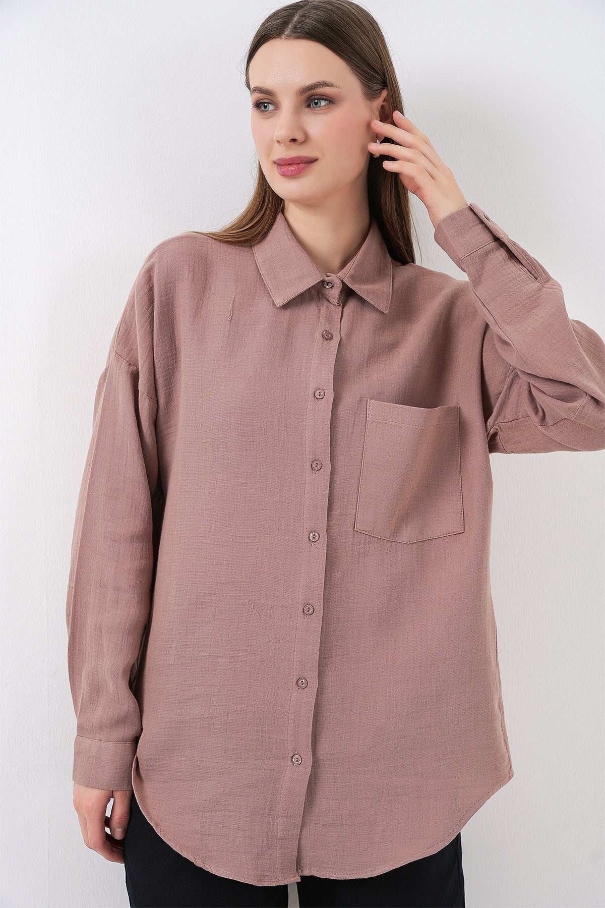 BGD Women Kadın Tek Cepli Oversize Müslin Gömlek 20353 - Gül Kurusu - Bendigo