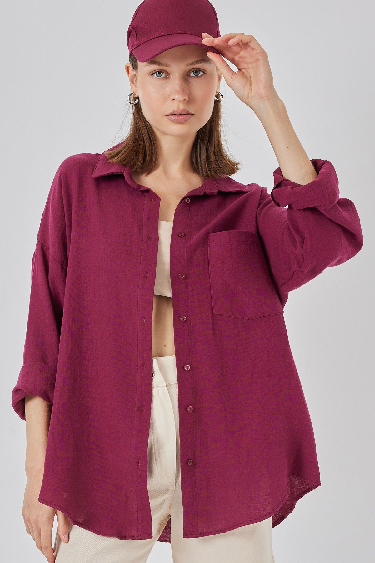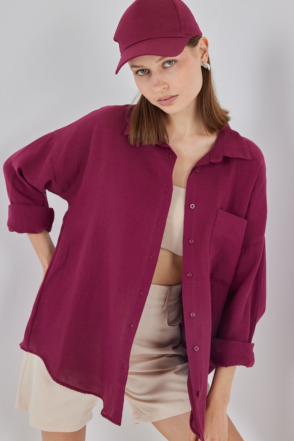 BGD Women Kadın Tek Cepli Oversize Müslin Gömlek 20353 - Mürdüm - Teramo
