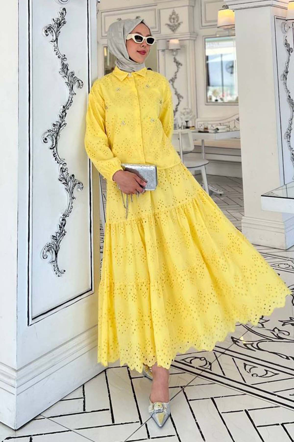 BNG Women Taş Detaylı Fisto Etekli Takım Sarı 1427 - Papantla de Olarte