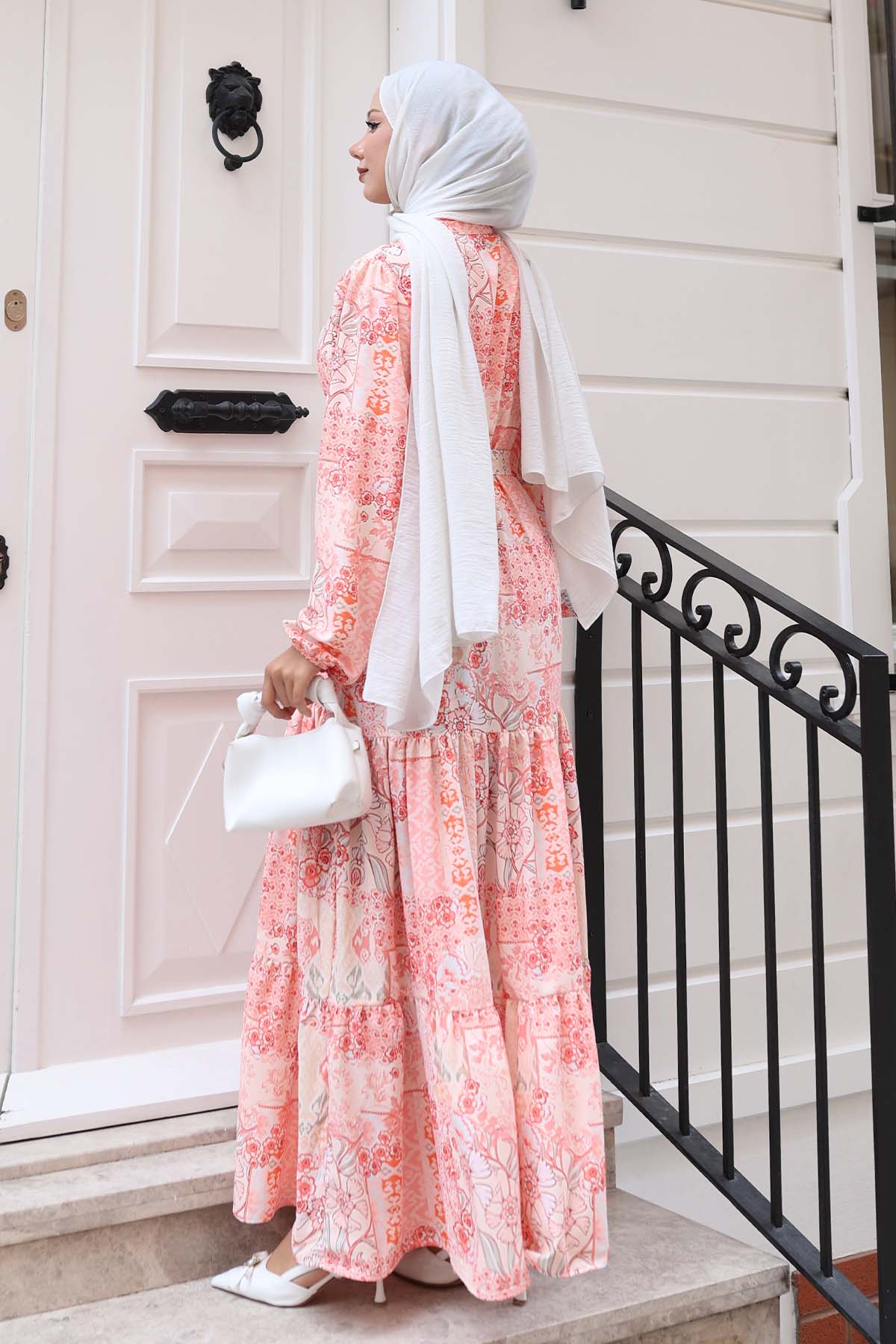 BNG Women Patterned Hijab Dress Salmon 520 - Silver Spring