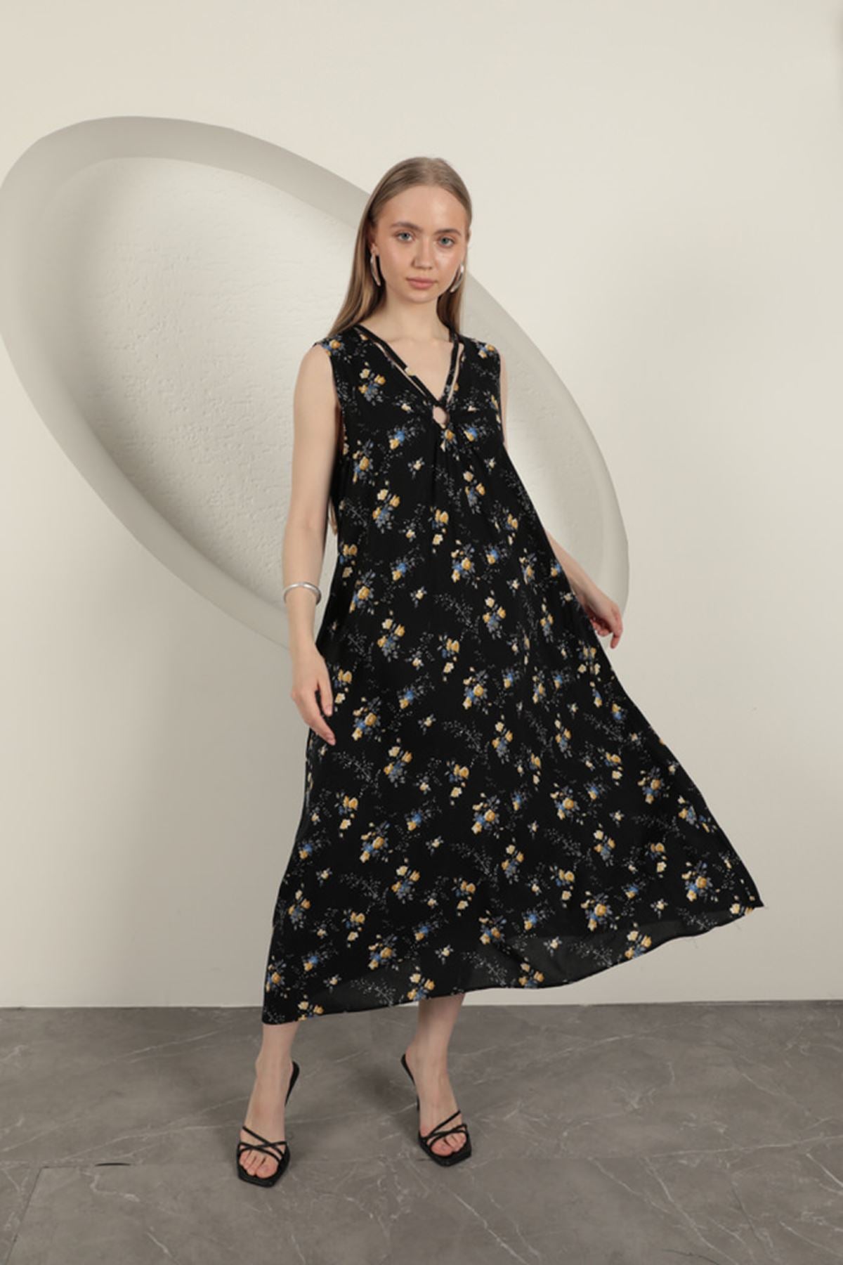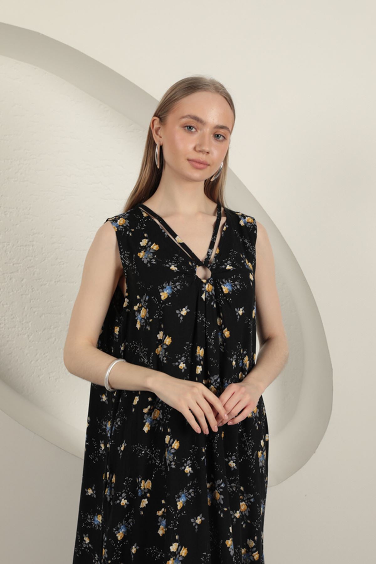 KKT Viscose Fabric Floral Patterned Dress-Black - Tezoyuca