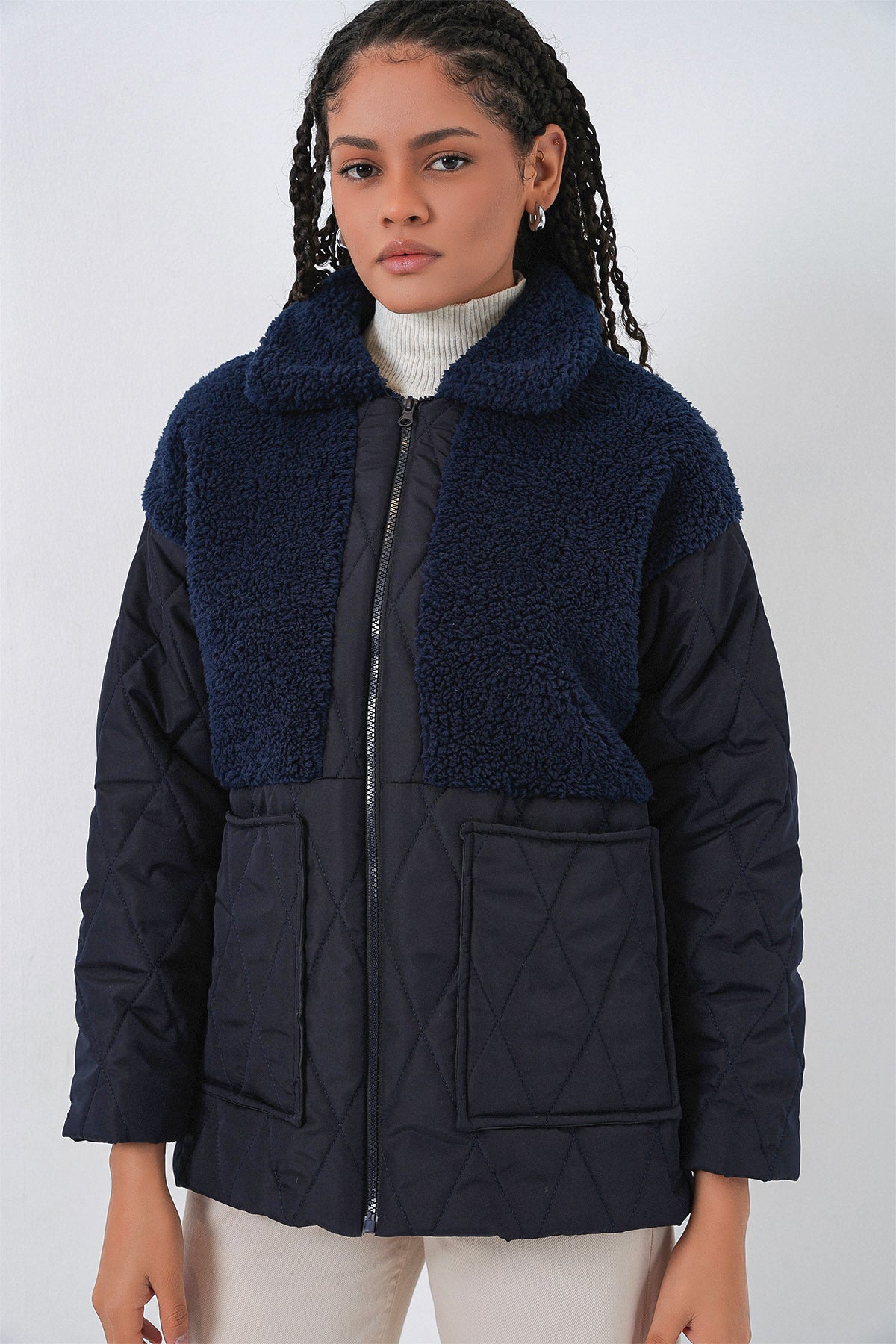 BGD Women Plush Detailed Oversized Puffer Jacket - Navy - Ocuilan de Arteaga