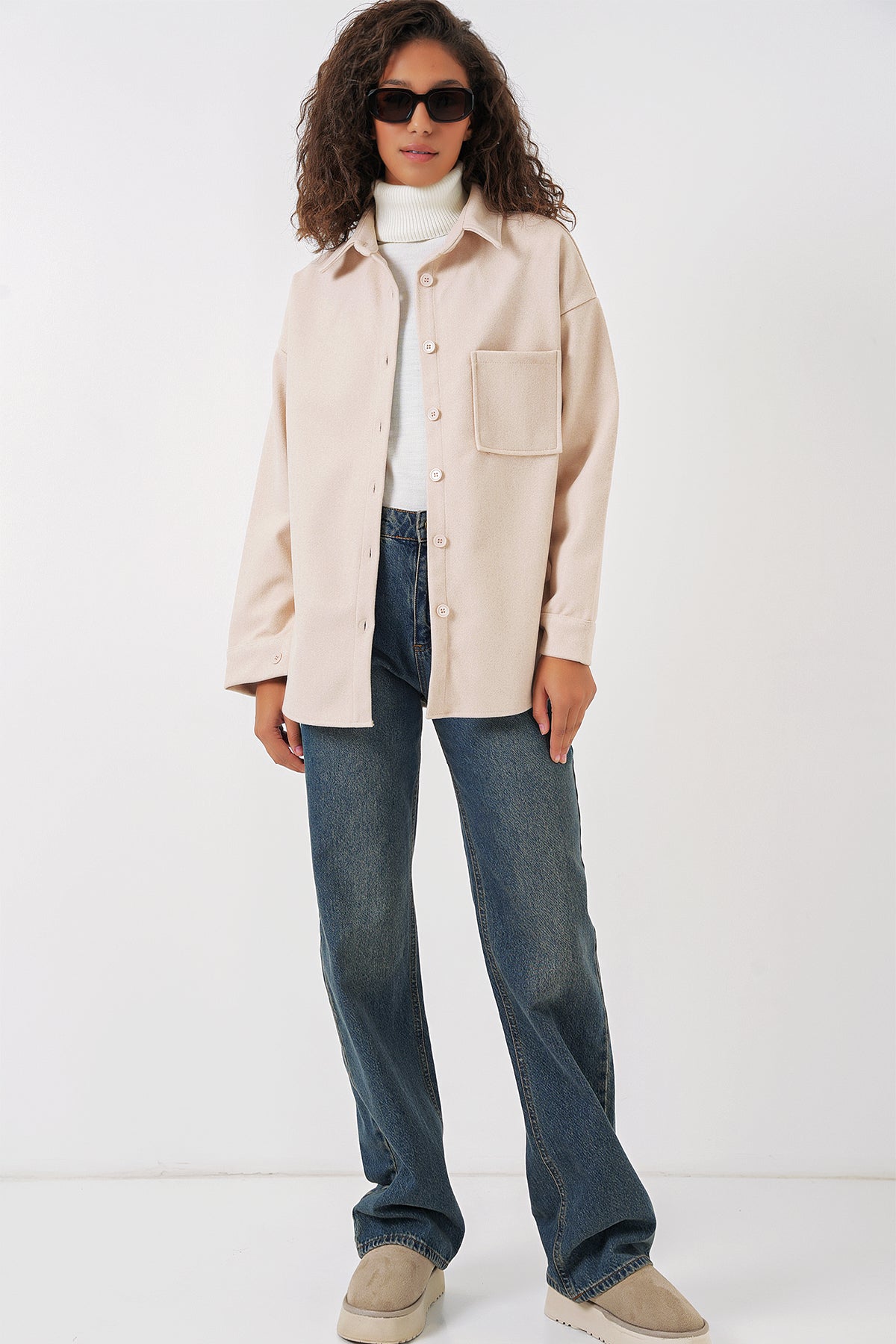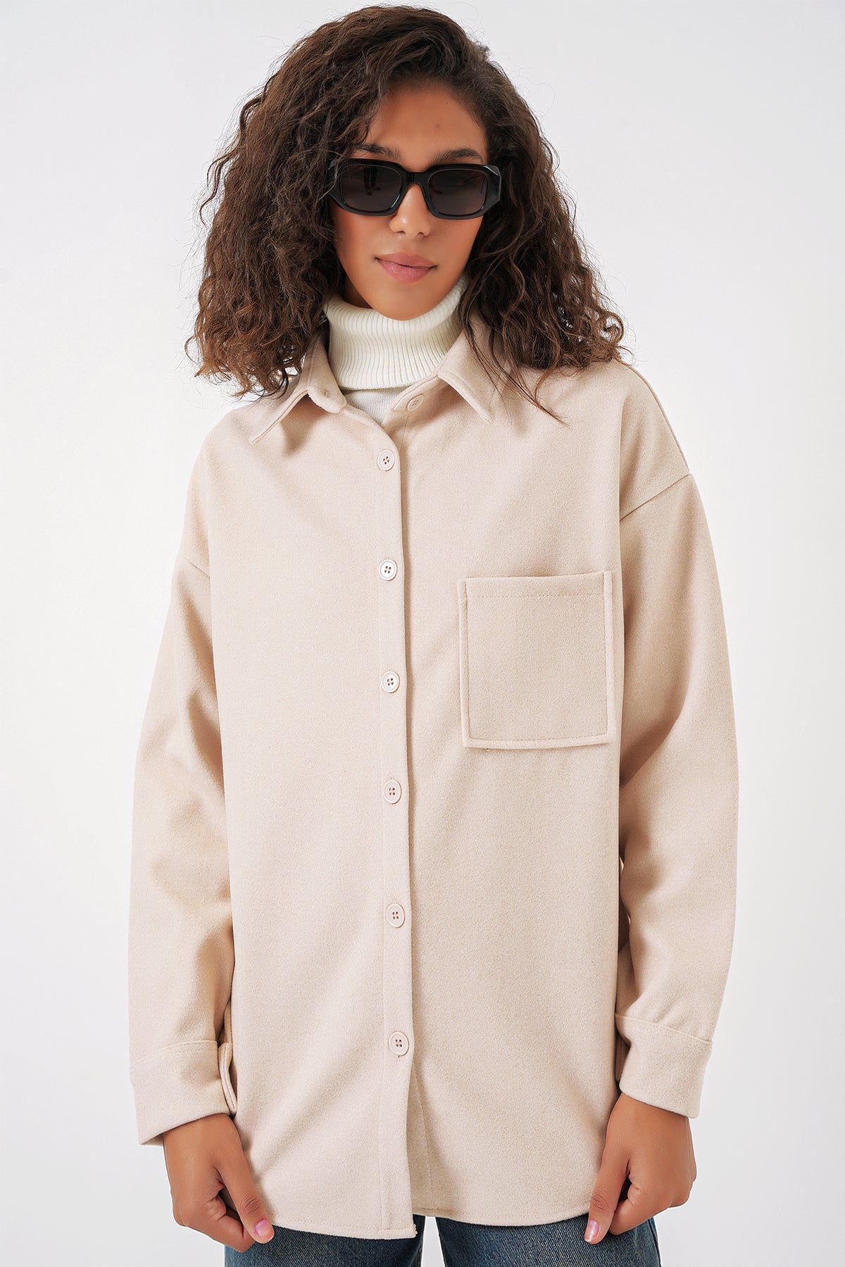 BGD Women Single Pocket Buttoned Coat Shirt - Cream - Plymouth
