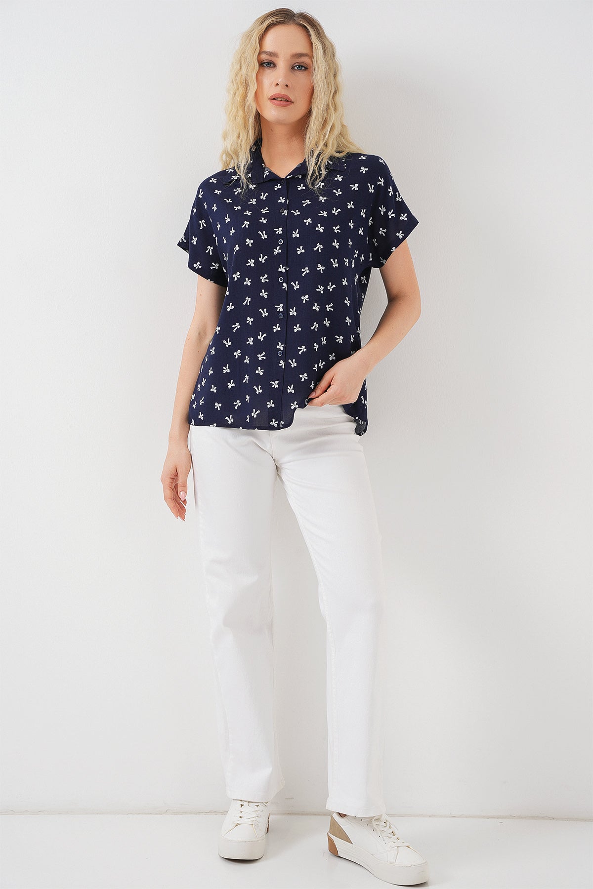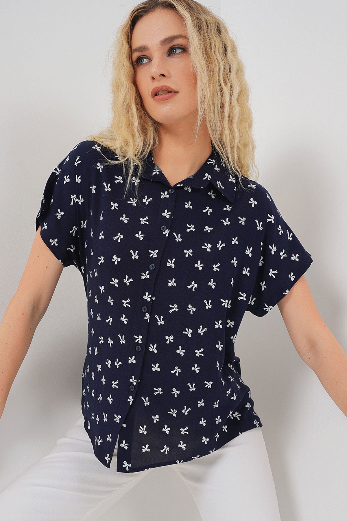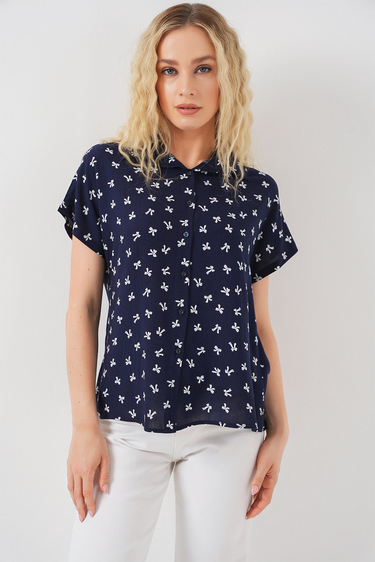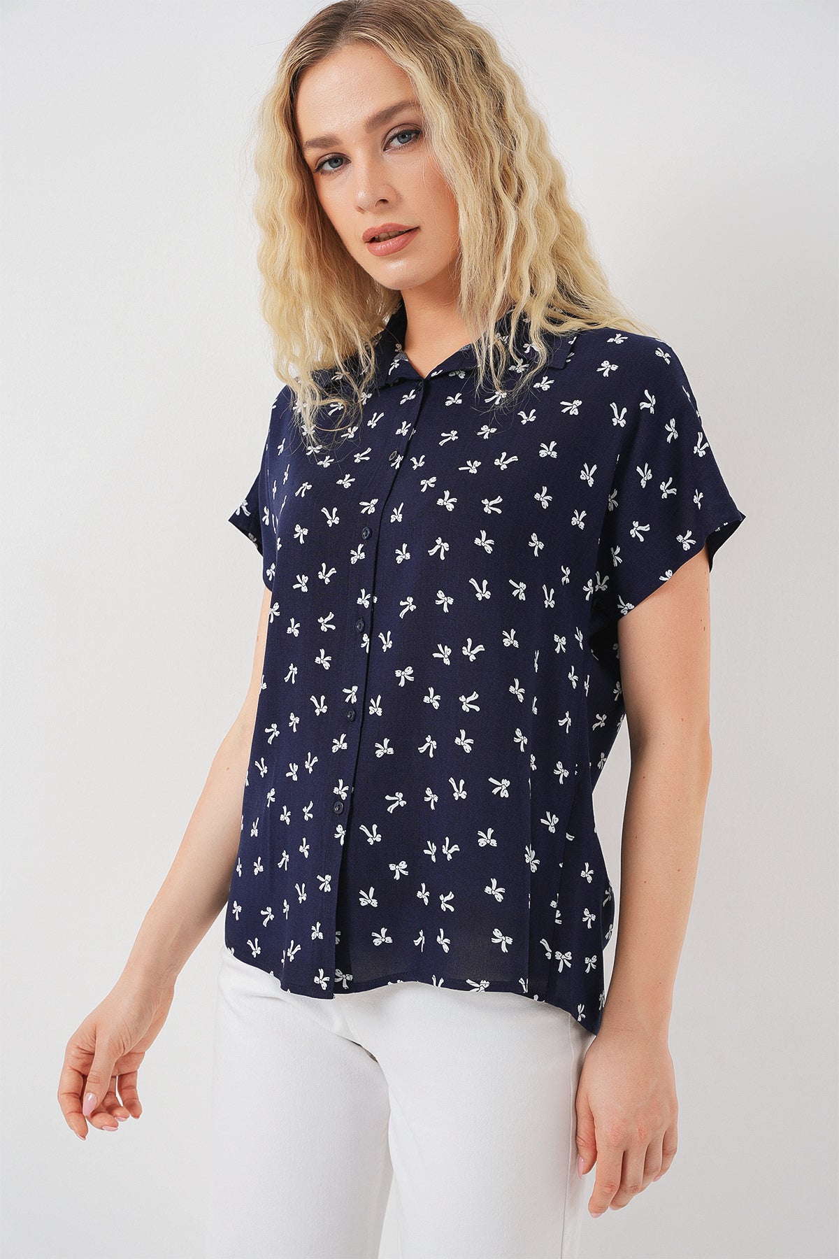 BGD Women Woman Short Sleeve Patterned Shirt 20310 - Navy Blue - Cambridge