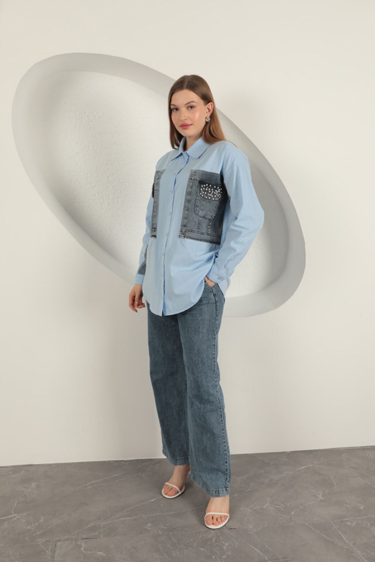 KKT Poplin Fabric Denim Garnished Blue Women's Shirt - Saarbrücken