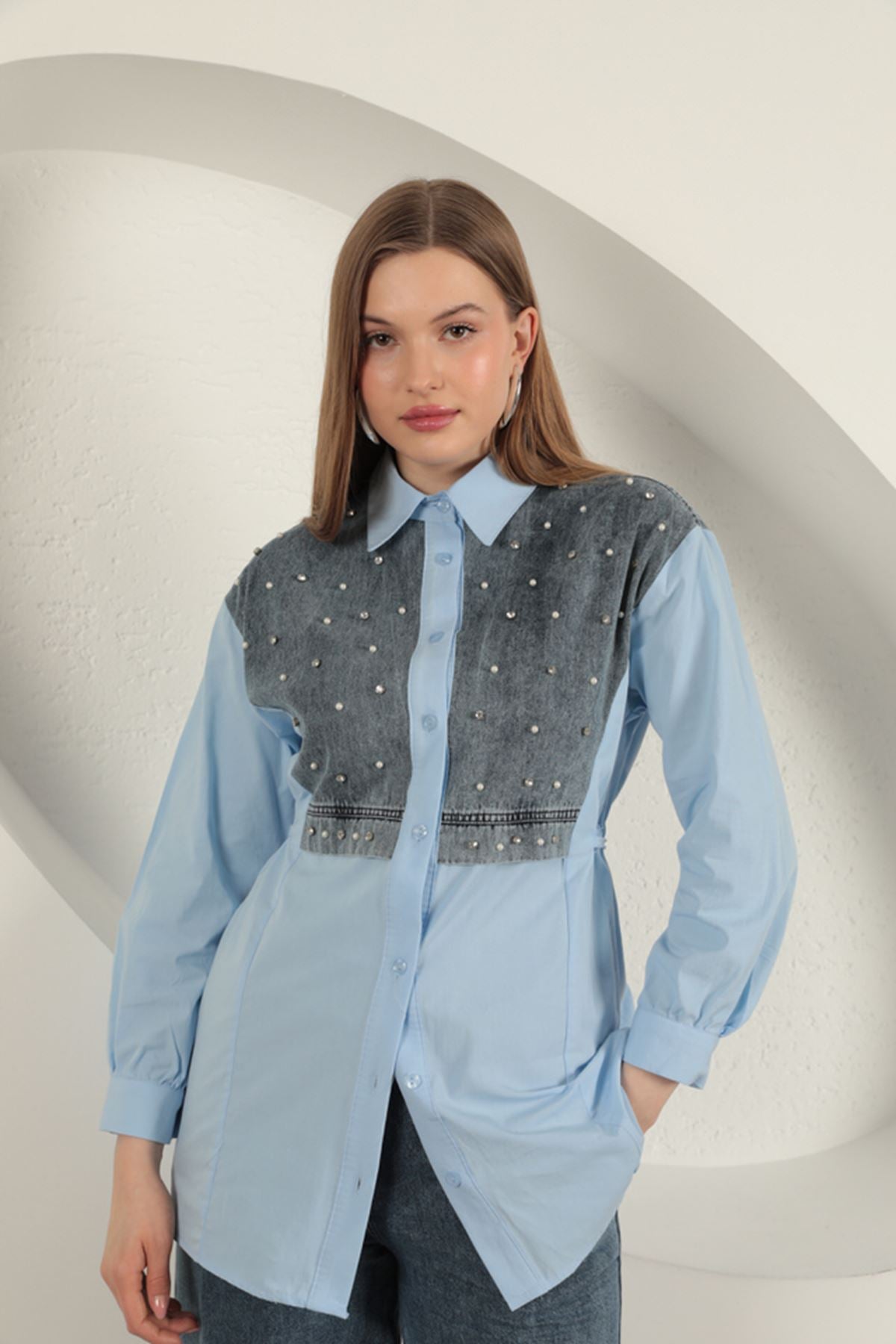 KKT Poplin Fabric Front Pearl Detailed Blue Women's Shirt - Dnipro