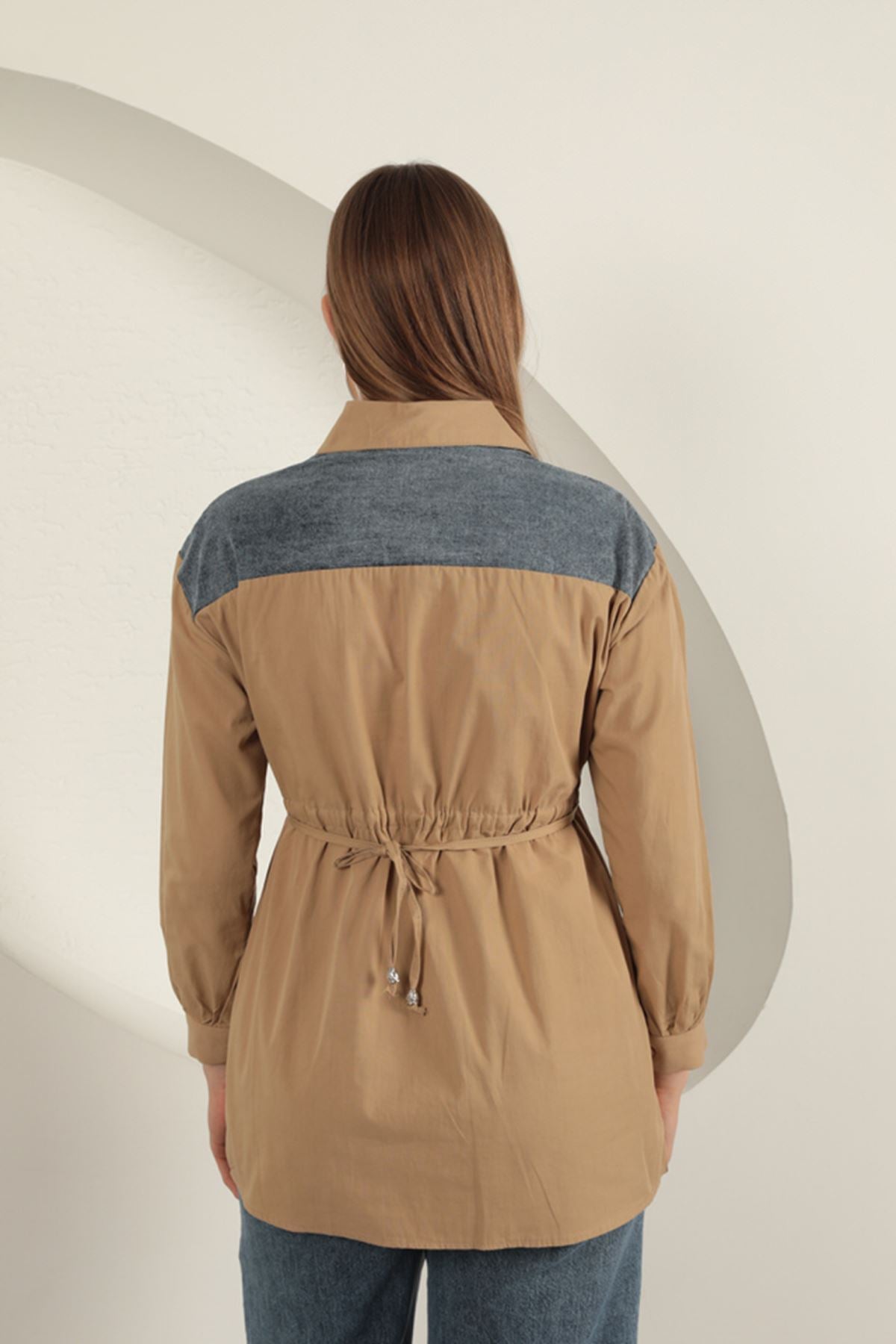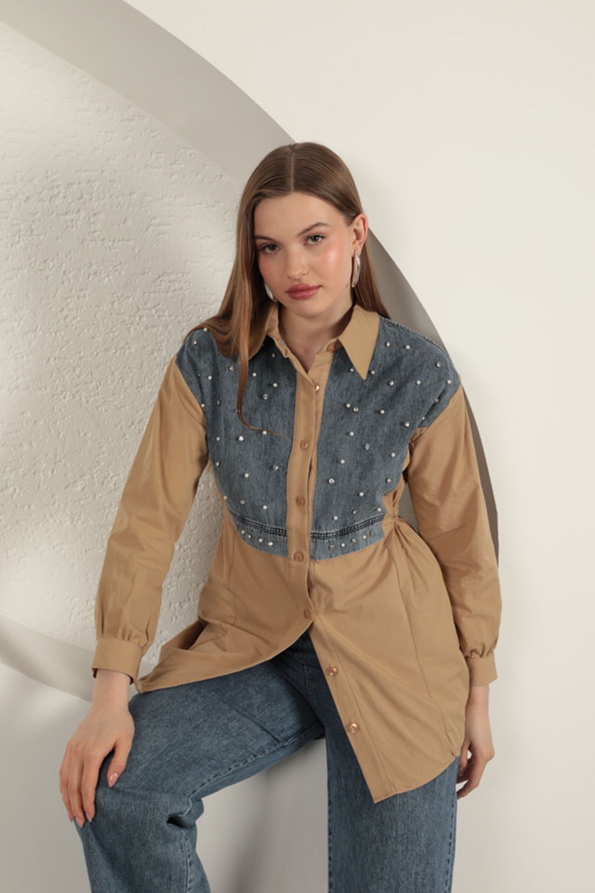 KKT Poplin Fabric Pearl Detailed Tan Women's Shirt - Den Helder