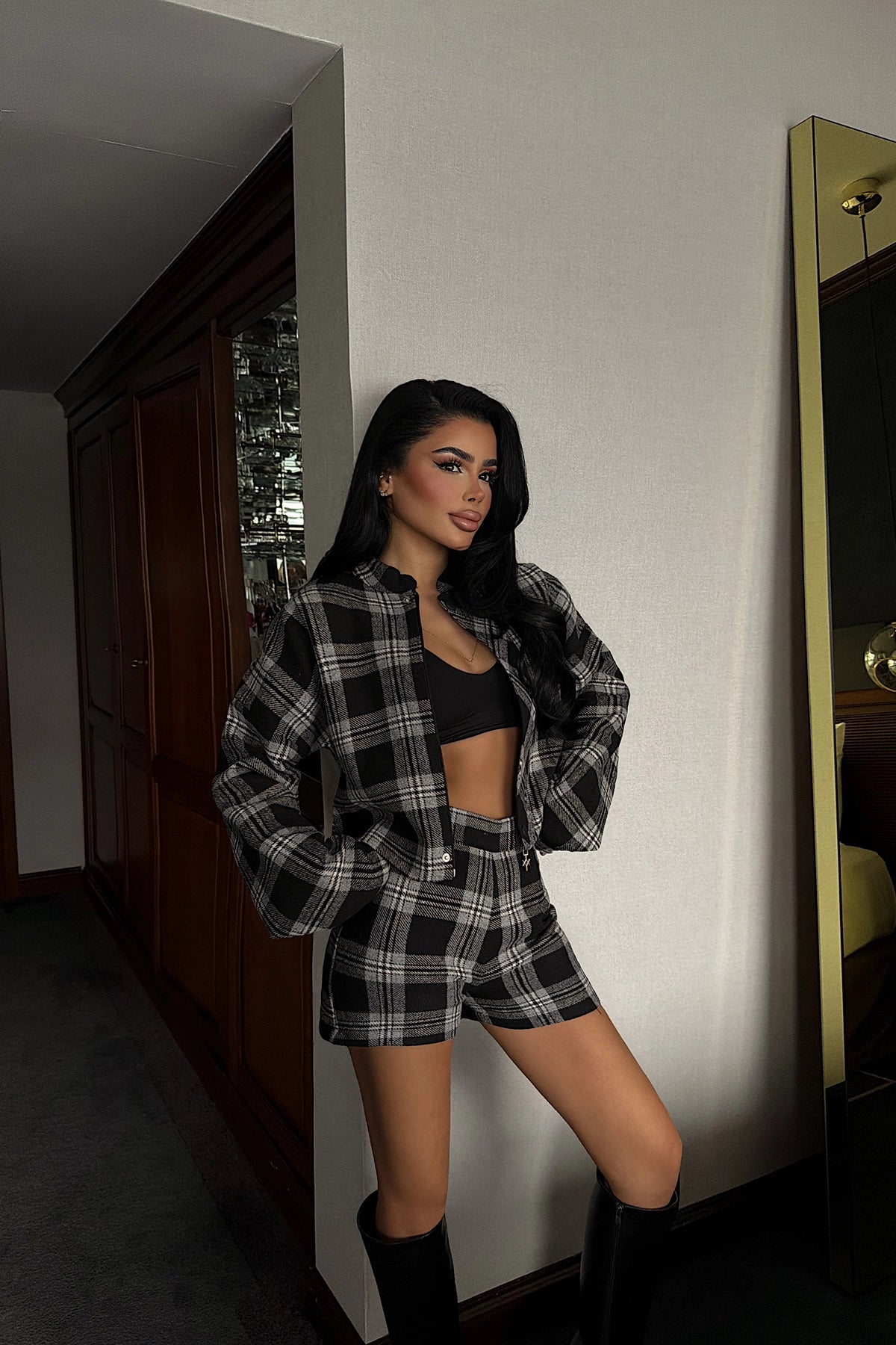 Black Plaid Shorts Set