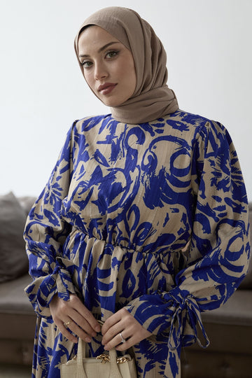 The blouse has a pattern. The sleeves are tied at the cuffs.