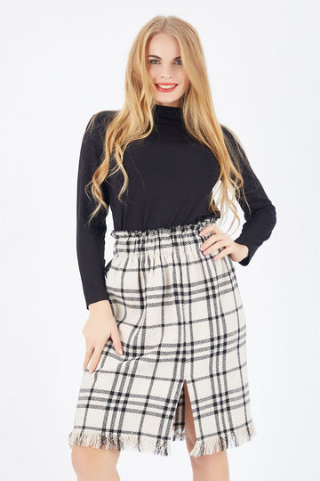 SNS Beige Black Thin Striped Slit Plaid Skirt - Warren