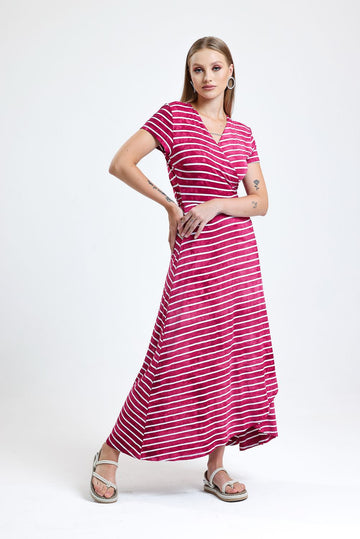 SNS Short Sleeve Front Tie Dress with Bordeaux Stripes and Wide Skirt - Amarillo