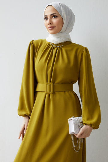It has a hidden zipper on the back, is beltable, and has neck stone embroidery detail.