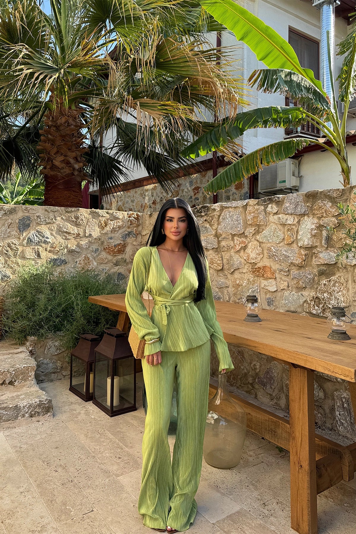 Olive Green Valerie Suit with Pants. Size S is used in the visual. Made of pleated fabric. Top length of the suit is 64 cm, Chest 51 cm, Bottom length 116 cm, Waist 35 cm. Model Measurements Height: 160 Weight: 50 Chest: 80 Waist: 62 Hips: 94.