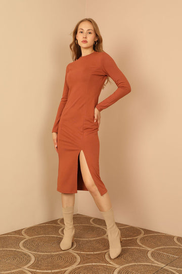 KKT Knit Fabric Long Sleeve Bicycle Collar Tight Fit Slit Mini Women Dress - Brick - Roeselare