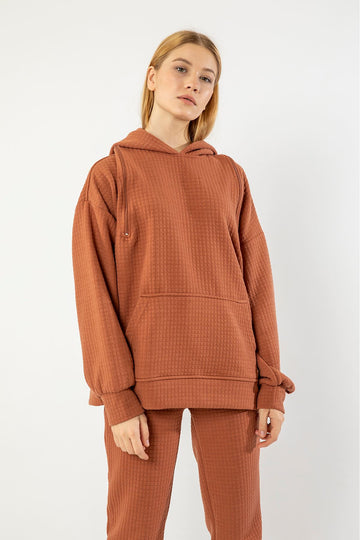 KKT Quilted Fabric Hooded Hip Height Oversize Zip Detailed Women Sweatshirt - Brick - Castrop-Rauxel