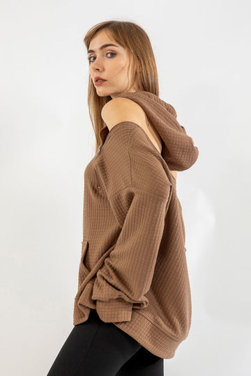 KKT Quilted Fabric Hooded Hip Height Oversize Zip Detailed Women Sweatshirt - Chanterelle - Stonecrest