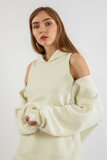KKT Quilted Fabric Hooded Hip Height Oversize Zip Detailed Women Sweatshirt - Ecru - Burgos