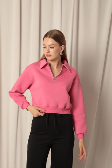 KKT Üç İplik Fermuarlı Kapüşonlu Kısa Kadın Pembe Sweat - Valdemoro