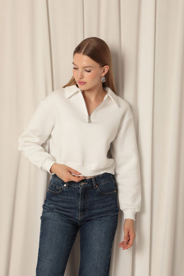 KKT Üç İplik Kumaş Fermuarlı Kapüşonlu Kısa Kadın Ekru Sweat - Évora