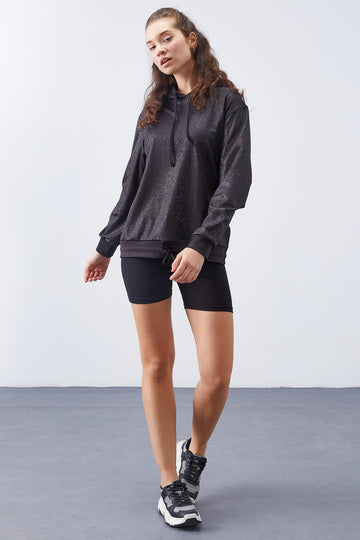 Black Silver Leaf Sequined Ruched Detail Comfort Fit Hooded Women's Sweatshirt - 97124