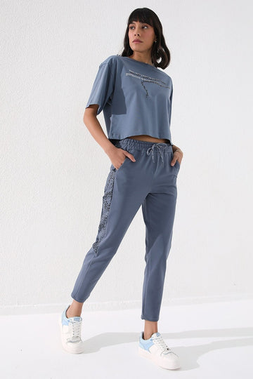 TMY Petrol Sides Leopard Pattern Comfortable Fit Slim Leg Women's Sweatpants - 94572 - Lakewood