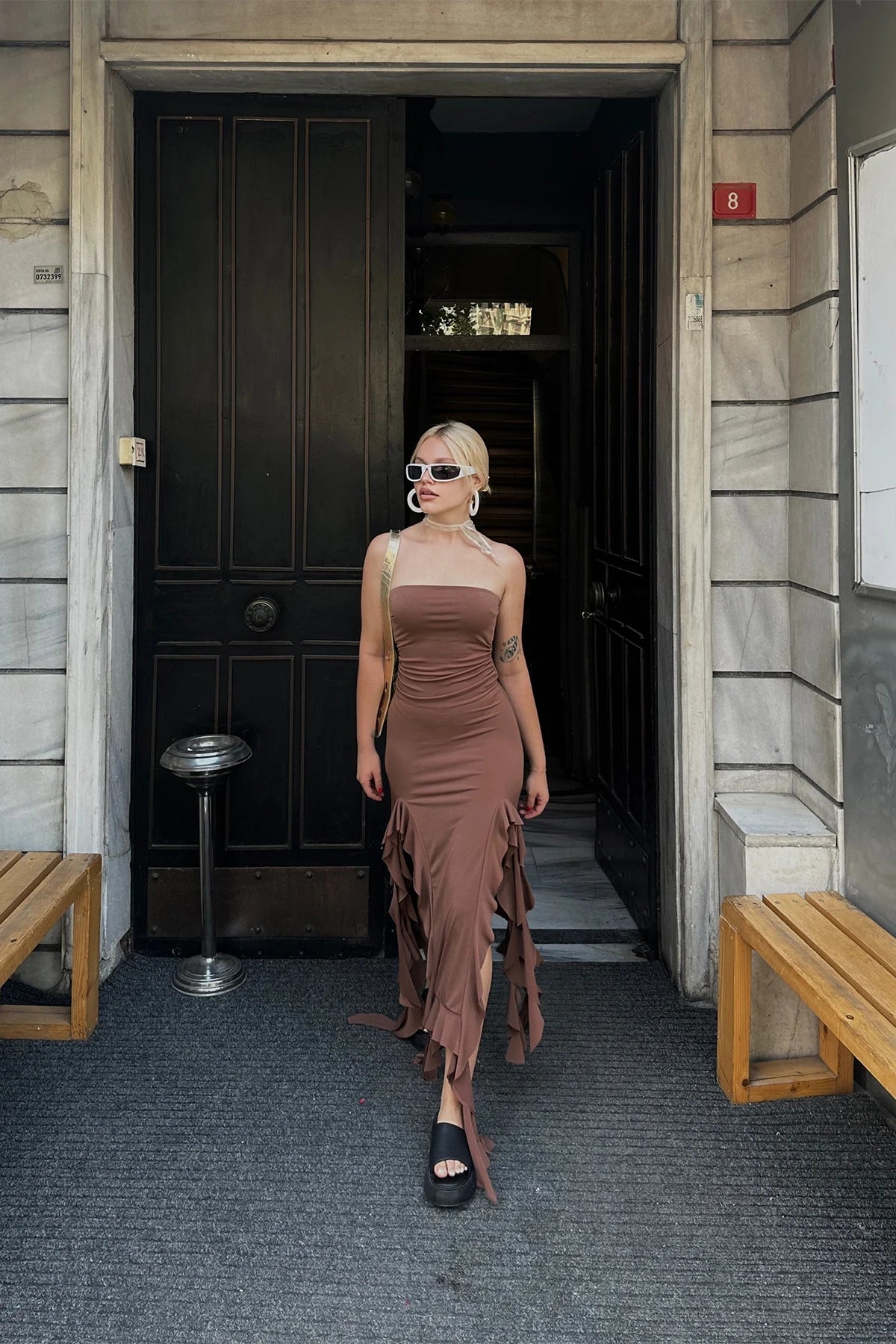 Brown Ruffled Strapless Dress