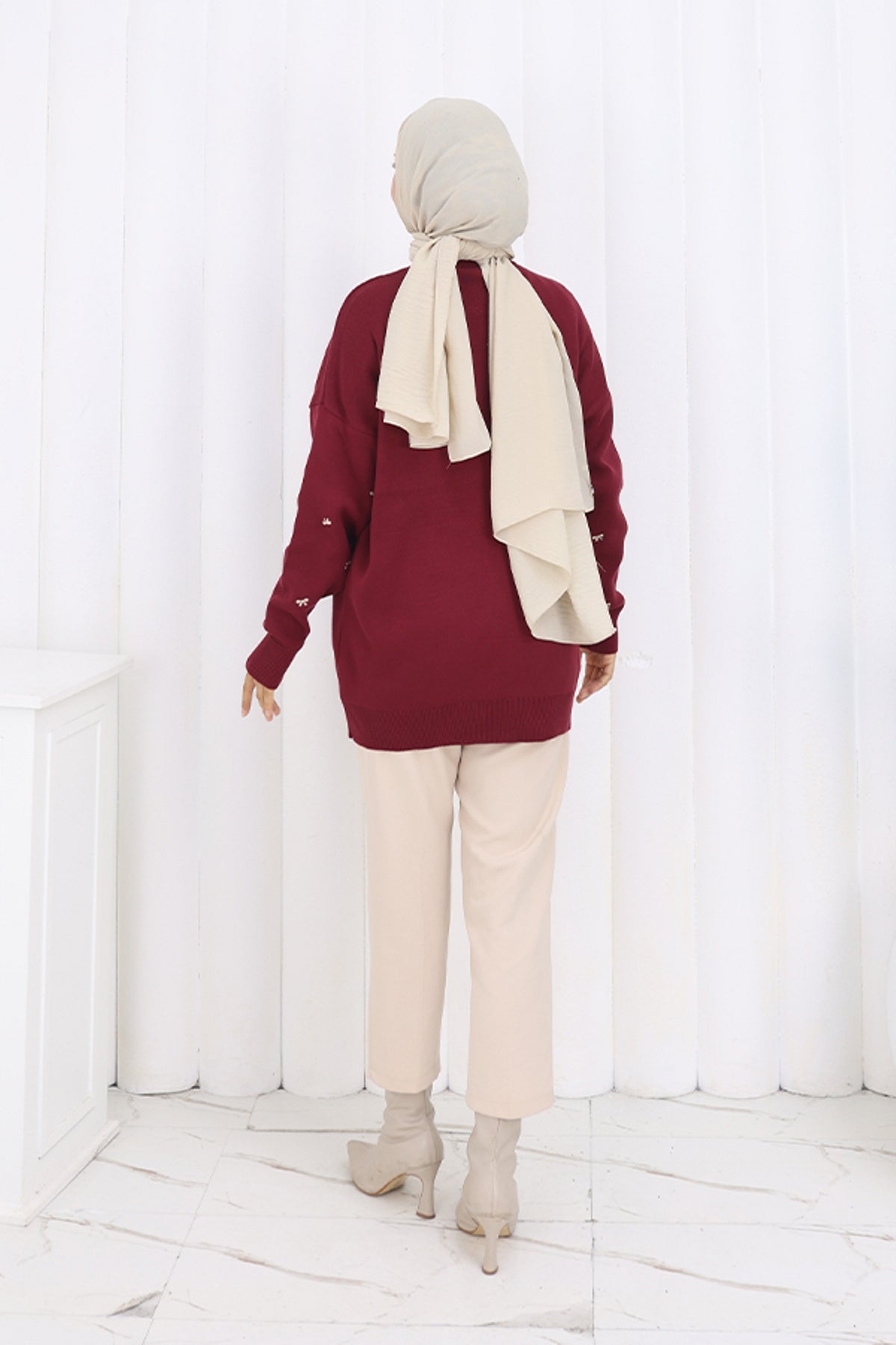 BNG Women Bow Patterned Sweater N3251 Burgundy - Weston-super-Mare