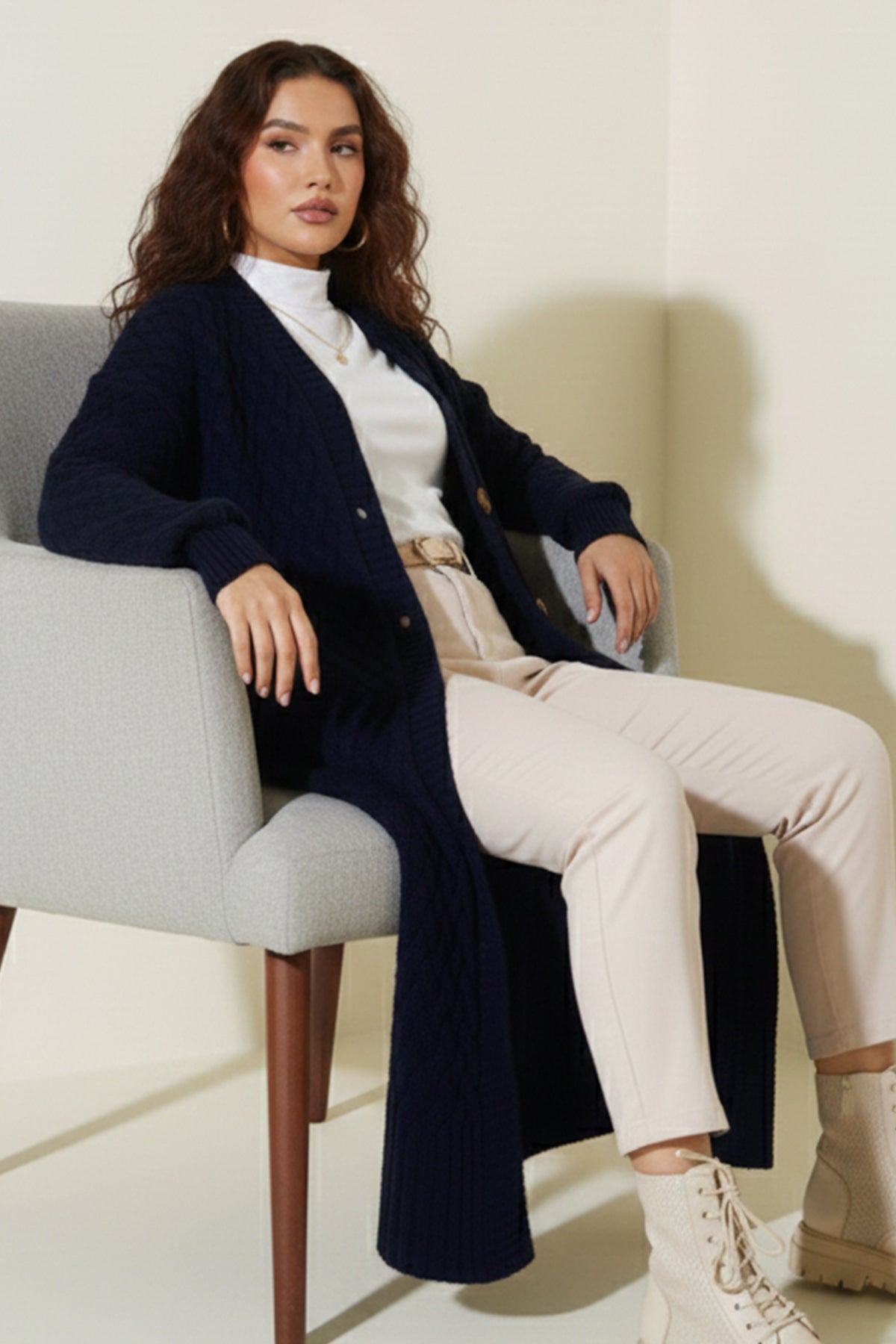 Product Information: Cardigan Length: 116 cm, Chest: 126 cm. Fabric type: 70% Acrylic 30% Wool Fabric. Model Measurements: Height: 168 cm, Chest: 83 cm, Waist: 68 cm, Hips: 90 cm. The product on the model is in Standard Size. There may be a slight difference in color tone due to concept shootings in the product color.