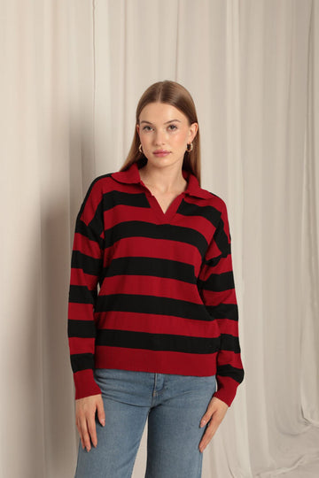 KKT Knitwear Fabric Striped Shirt Collar Women's Red Sweater - Vila Nova de Gaia